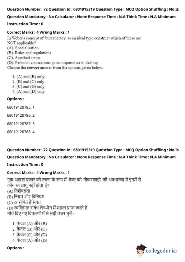In Weber's concept of bureaucracy, the ideal type includes features such as specialisation (A) and rules and regulations (B), which help ensure efficiency and standardisation. However, ascribed status (C) and personal connections (D) are not applicable to the ideal type of bureaucracy. In a bureaucratic system, appointments and promotions are based on merit and rules, not on personal relationships or inherited status. Quick Tip: Weber's model of bureaucracy is essential for understanding the organization of modern administrative structures, emphasizing rationality and impersonal rules.