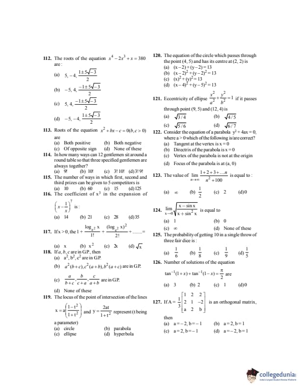 Suppose the parabola is given by \(y = x^2 + px + q\) and it cuts the \(y\)-axis at points \(A(\alpha, 0)\) and \(B(\beta, 0)\). Then, \(\alpha\) and \(\beta\) are roots of the equation: \[ x^2 + px + q = 0 \] Therefore, \(\alpha + \beta = -p\) and \(\alpha\beta = q\). The parabola \(y = x^2 + px + q\) cuts the \(y\)-axis at \((0, q)\). Let the equation of the circle passing through \(A\), \(B\), and \(C\) be: \[ x^2 + y^2 + 2gx + 2fy + c = 0 \quad \text{(i)} \] From points \(A\) and \(B\): \[ \alpha^2 + 2g\alpha + c = 0 \quad \text{(ii)} \] \[ \beta^2 + 2g\beta + c = 0 \quad \text{(iii)} \] And for point \(C(0, q)\): \[ q^2 + 2fq + c = 0 \quad \text{(iv)} \] Subtracting equation (iii) from (ii), we have: \[ \alpha + \beta + 2g = 0 \quad \Rightarrow \quad g = -\frac{p}{2} \] Adding equations (ii) and (iii), we get: \[ \alpha^2 + \beta^2 + 2g(\alpha + \beta) + 2c = 0 \] \[ (\alpha + \beta)^2 - 2\alpha\beta + 2g(\alpha + \beta) + 2c = 0 \] \[ p^2 - 2q - p^2 + 2c = 0 \quad \Rightarrow \quad c = q - \frac{p^2}{2} \] Using \(c = q\) in equation (iv), we solve: \[ q^2 + 2fq + q = 0 \quad \Rightarrow \quad f = -\left(q + \frac{1}{2}\right) \] Substituting the values of \(g\), \(f\), and \(c\) back into equation (i), we derive the equation of the family of circles passing through points \(A\), \(B\), and \(C\): \[ x^2 + y^2 - px + (q + 1)y + q = 0 \] Clearly, it passes through \((0, 1)\). Thus, the correct answer is Option B. Quick Tip: When dealing with curves like parabolas and families of circles passing through specific points, the geometry often dictates that the family of circles passes through a fixed point, which can be found through intersection properties.