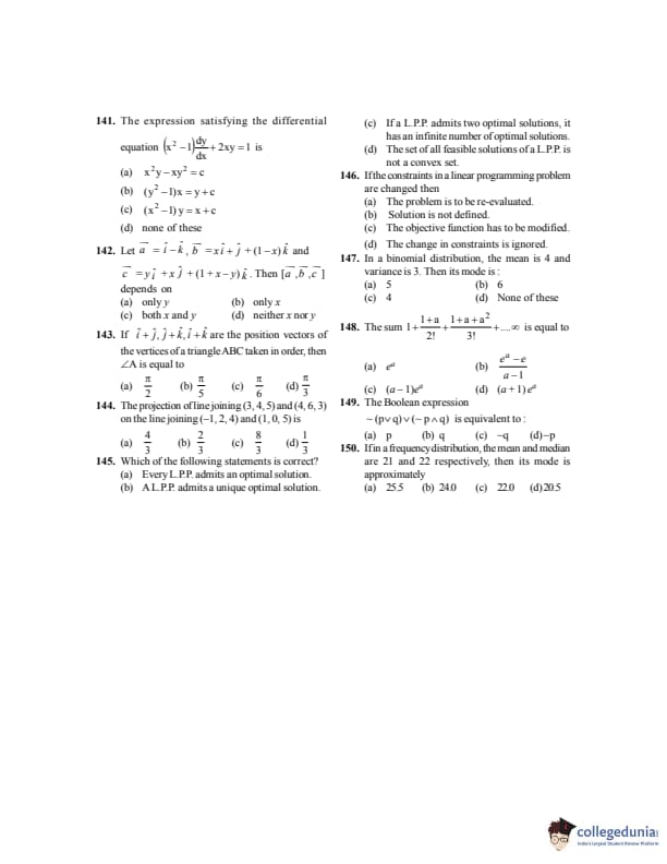 Let \( y = (1 + x)^{\frac{1}{x}} \). Then, \[ \log y = \frac{1}{x} \log(1 + x) = \frac{1}{x} \left( x - \frac{x^2}{2} + \frac{x^3}{3} - \frac{x^4}{4} + \ldots \right) \] \[ = 1 - \frac{x}{2} + \frac{x^2}{3} - \frac{x^3}{4} + \ldots \] So, \[ y = e^{\log y} = e^{1 - \frac{x}{2} + \frac{x^2}{3} - \ldots} = e \cdot e^{-\frac{x}{2} + \frac{x^2}{3} - \ldots} \] \[ = e \left( 1 + \left( -\frac{x}{2} + \frac{x^2}{3} \right) + \frac{1}{2!} \left( -\frac{x}{2} + \frac{x^2}{3} \right)^2 + \ldots \right) \] \[ = e \left( 1 + \left( -\frac{x}{2} + \frac{x^2}{3} \right) + \frac{1}{2} \left( \frac{x^2}{4} - \frac{2x^3}{6} + \frac{x^4}{9} \right) + \ldots \right) \] Thus, \[ y - e + \frac{1}{2} e^x = e \left[ \frac{1}{3} x^2 + \left(\frac{1}{2} \times \frac{x^2}{4}\right) \right] + \ldots = e \left[ \frac{1}{3} x^2 + \frac{1}{8} x^2 \right] + \ldots \] \[ = e \left[ \frac{3}{8} x^2 \right] + \ldots \] Therefore, \[ \lim_{x \to 0} \frac{y - e + \frac{1}{2} e^x}{x^2} = e \left[ \frac{1}{3} + \frac{1}{8} \right] = \frac{11}{24} e \] Quick Tip: For limits involving complex functions, expansions such as Taylor or Maclaurin series are extremely helpful in simplifying expressions by removing higher order terms which do not affect the limit.