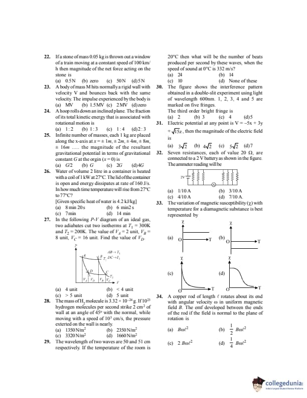 Step 1: When the container is moving, the gas molecules inside have kinetic energy due to their motion. For a monoatomic ideal gas, the total kinetic energy is given by the formula: \[ E_k = \frac{3}{2} n R T \] where \( n \) is the number of moles, \( R \) is the universal gas constant, and \( T \) is the temperature of the gas. Step 2: When the container is suddenly stopped, the gas molecules stop moving in the direction of the container's motion, and the kinetic energy associated with the motion of the container is converted into internal energy, which causes the temperature to increase. Step 3: The total kinetic energy of the gas molecules is related to the motion of the container. The kinetic energy of the container is \( \frac{1}{2} m v^2 \), where \( m \) is the mass of the gas and \( v \) is the velocity of the container. Step 4: Since the system is insulated, the change in internal energy equals the change in kinetic energy. For an ideal monoatomic gas, the change in temperature is related to the change in internal energy. The equation for the change in temperature \( \Delta T \) is: \[ \Delta T = \frac{E_k}{n C_V} \] where \( C_V = \frac{3}{2} R \) is the molar specific heat at constant volume. Step 5: Substituting \( E_k = \frac{1}{2} m v^2 \) and solving for \( \Delta T \): \[ \Delta T = \frac{\frac{1}{2} m v^2}{n \cdot \frac{3}{2} R} = \frac{m v^2}{3 n R} \] Since \( n = \frac{m}{M} \) (where \( M \) is the molar mass), we get: \[ \Delta T = \frac{m v^2}{3 R} \] Thus, the change in the temperature of the gas is \( \boxed{\frac{mv^2}{3R}} \). Quick Tip: For a monoatomic gas, the change in temperature due to the kinetic energy change when the container stops is directly proportional to the square of the velocity of the container, and inversely proportional to the gas constant \( R \).
