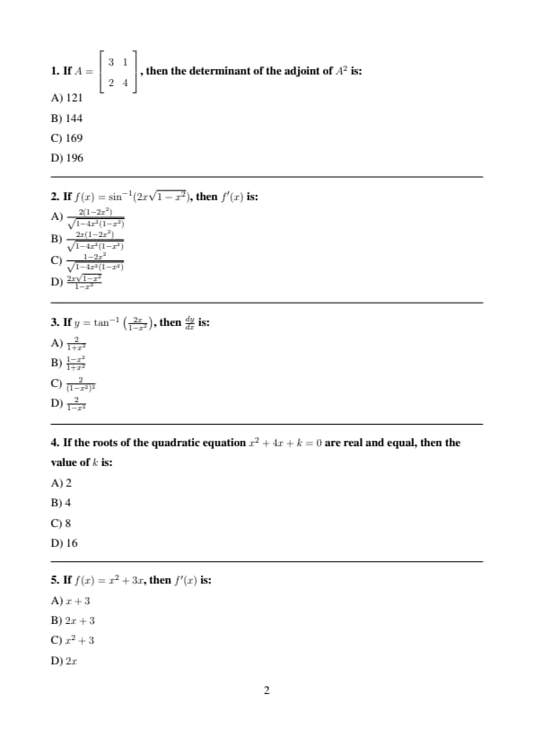 If \( f(x) = \sin^{-1}(2x\sqrt{1 - x^2}) \), then \( f'(x) \) is: