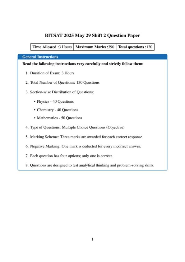 The BITSAT 2025 Exam for 29th May, 2025, Shift 2 was conducted from 2:00 P.M. to 5:00 P.M. in CBT Mode in more than 74 exam centres across the country.