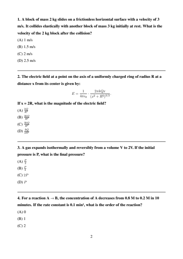 A block of mass 2 kg slides on a frictionless horizontal surface with a velocity of 3 m/s. It collides elastically with another block of mass 3 kg initially at rest. What is the velocity of the 2 kg block after the collision?