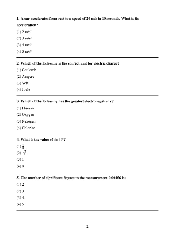 A car accelerates from rest to a speed of 20 m/s in 10 seconds. What is its acceleration?
