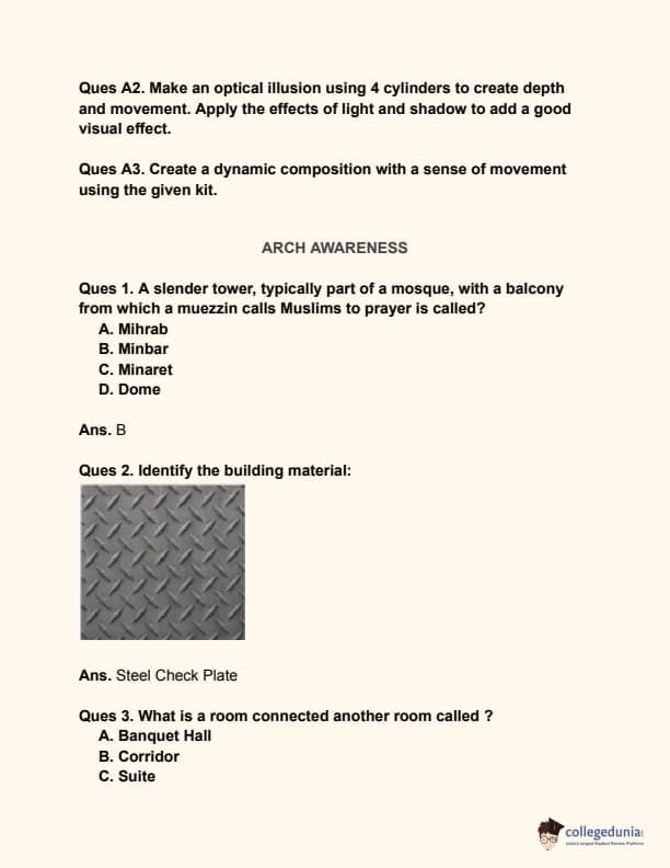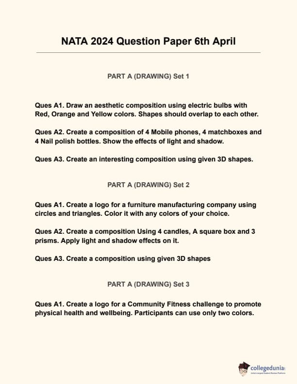 NATA 2024 Question Paper with Answer Key (April 6) is available for download here. The exam was successfully organized by Council of Architecture (COA) on April 6, 2024. The question paper comprised a total of 48 questions divided into 2 sections. Candidates can check the memory based NATA 2024 question paper available for download using the link below.