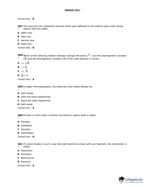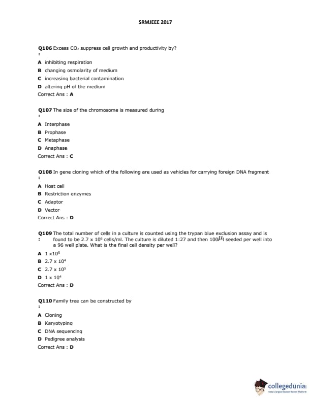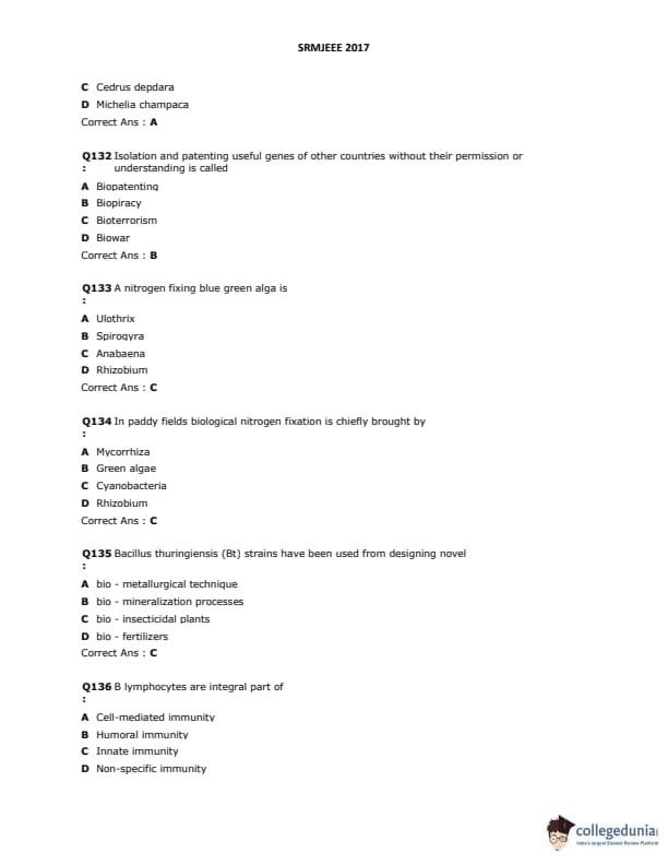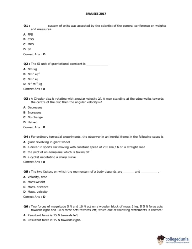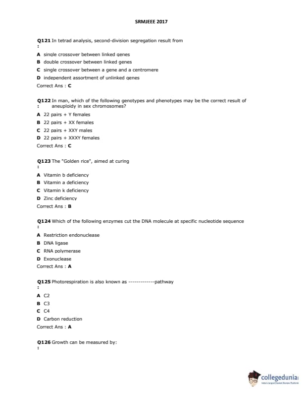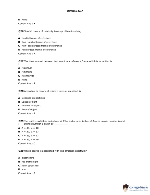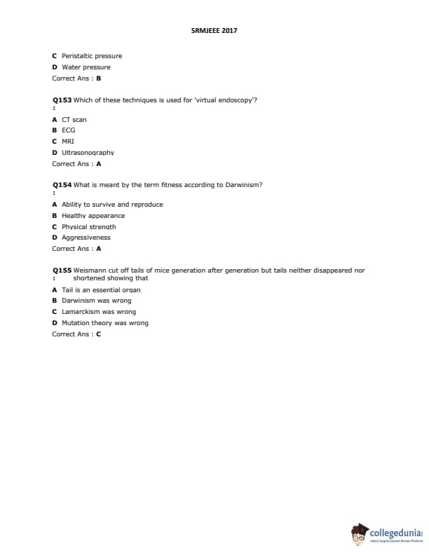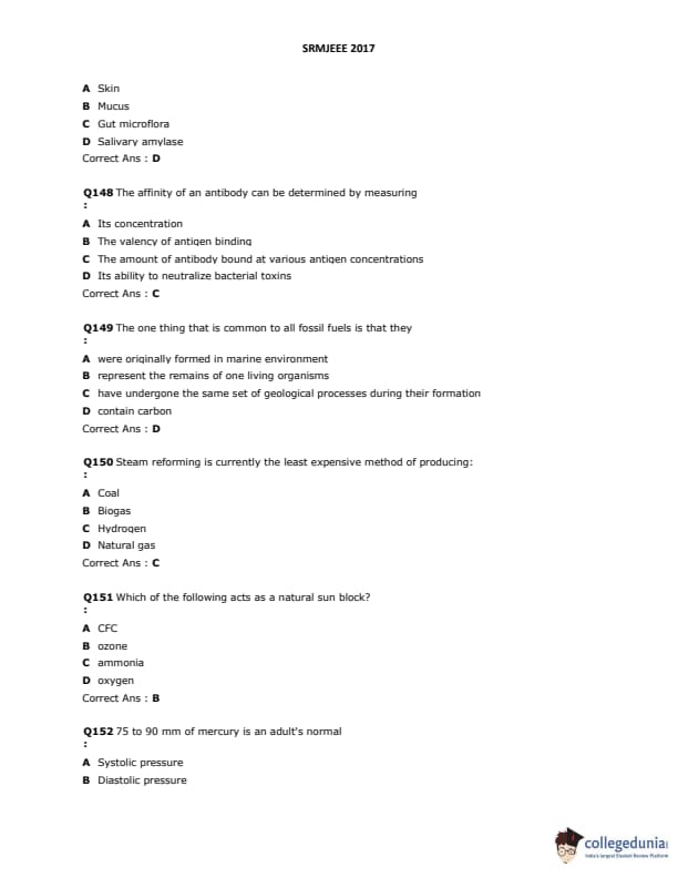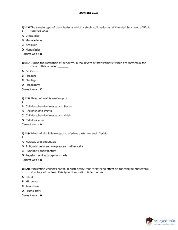 SRMJEEE 2017 Question paper with answer key pdf is available for download. The exam was successfully organized by SRM University. The question paper comprised a total of 155 questions.