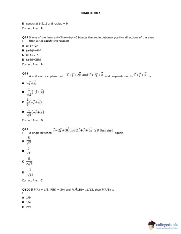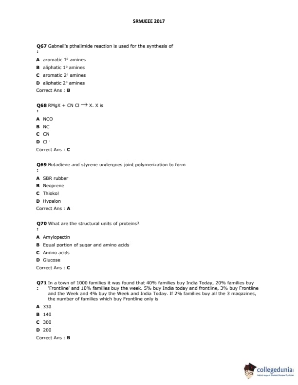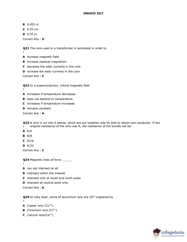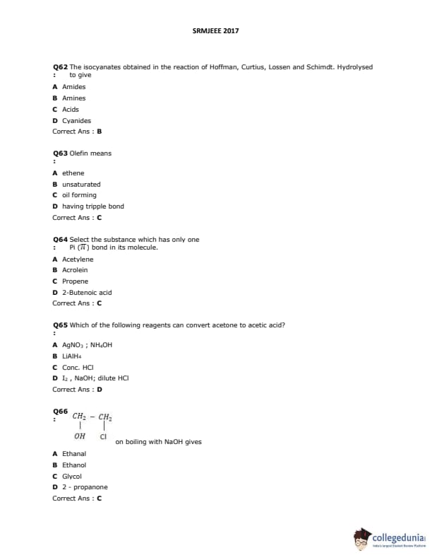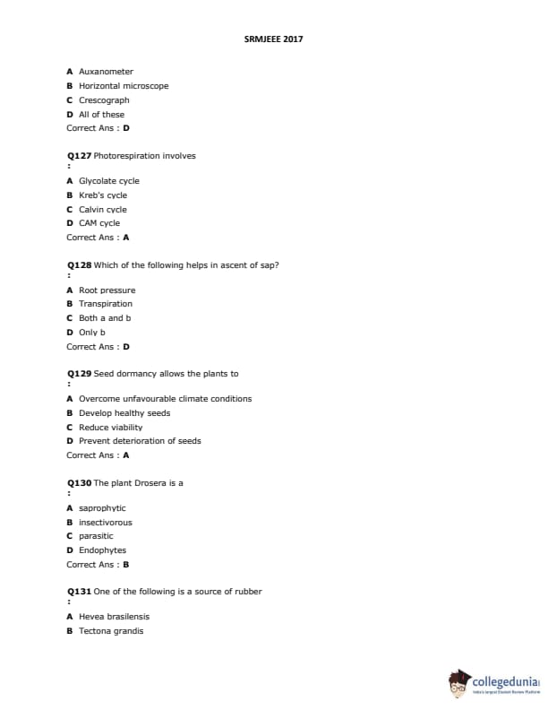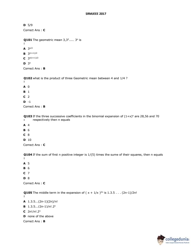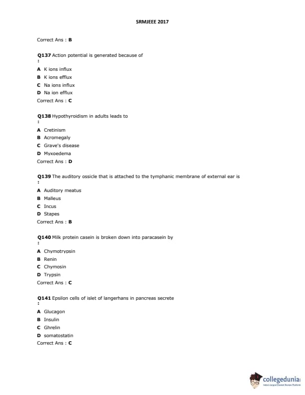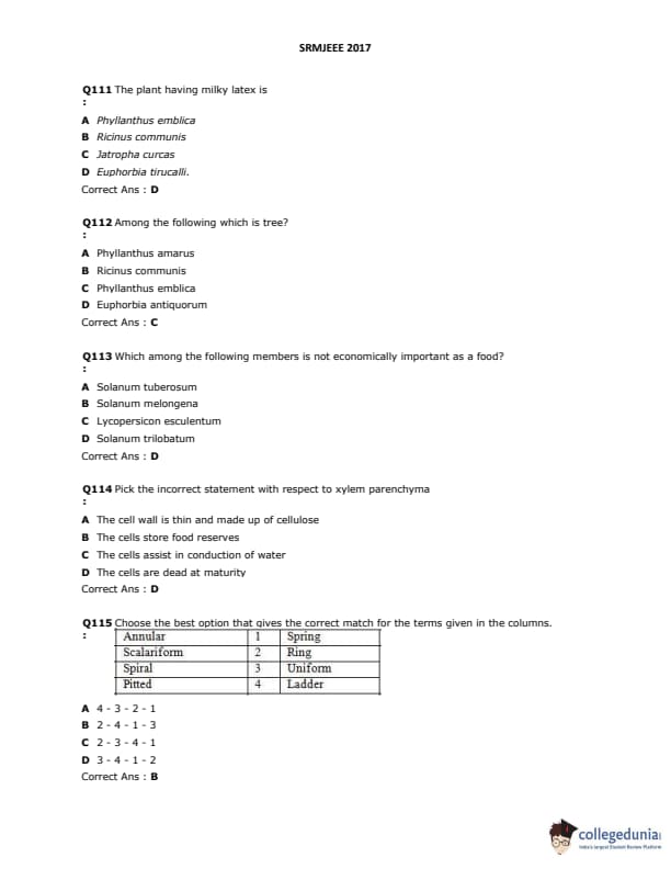SRMJEEE 2017 Question paper with answer key pdf is available for download. The exam was successfully organized by SRM University. The question paper comprised a total of 155 questions.