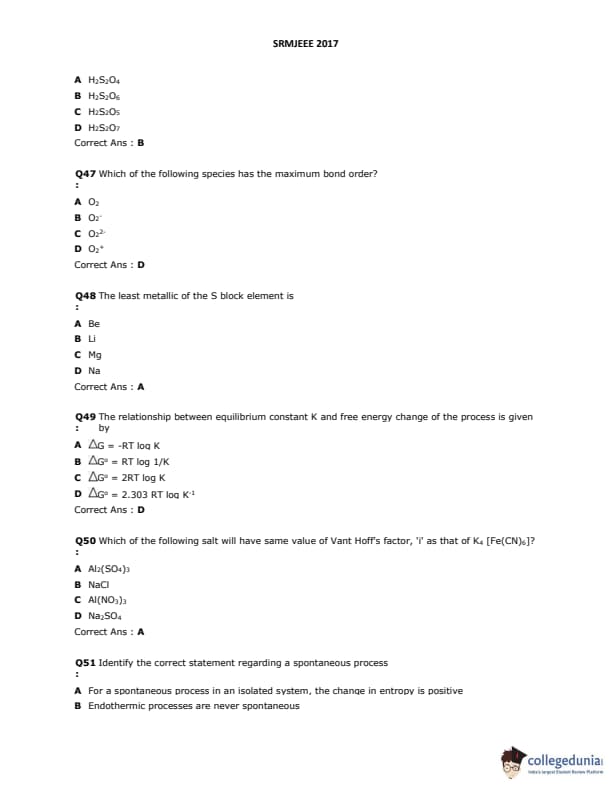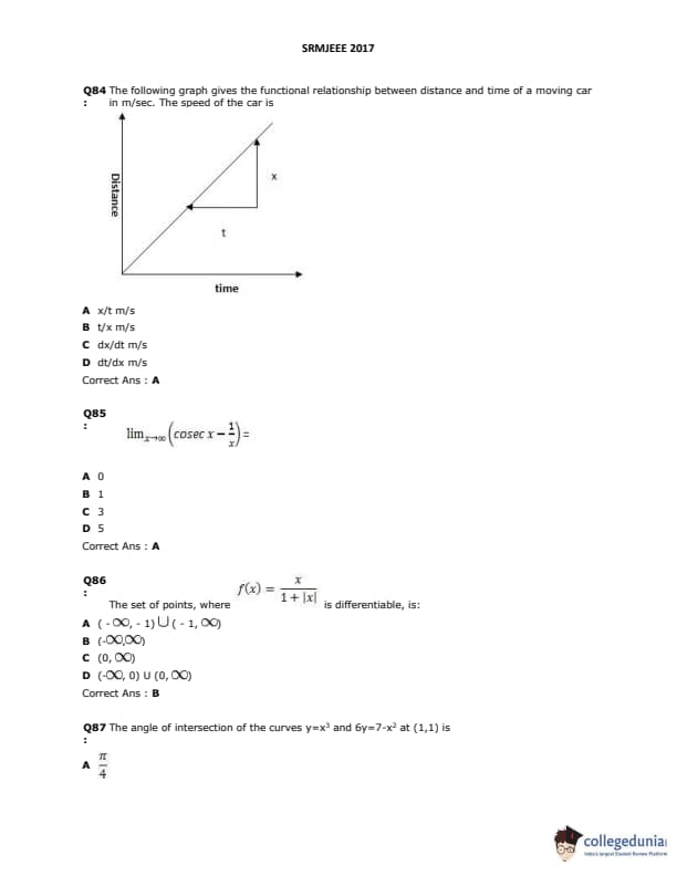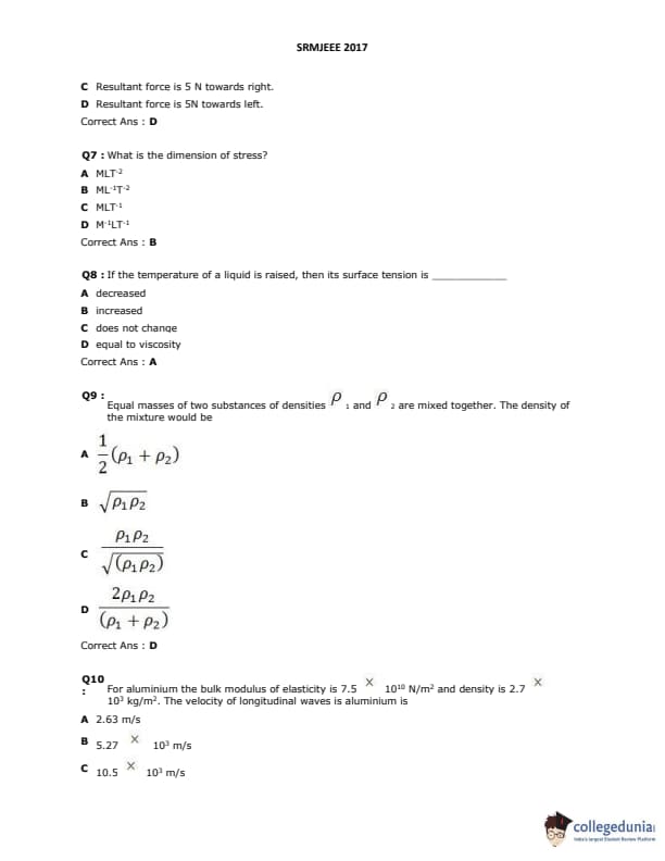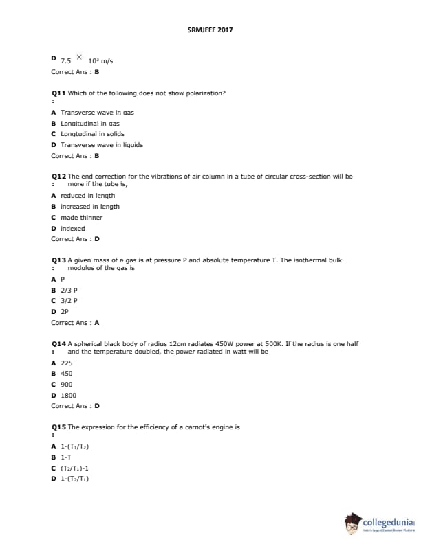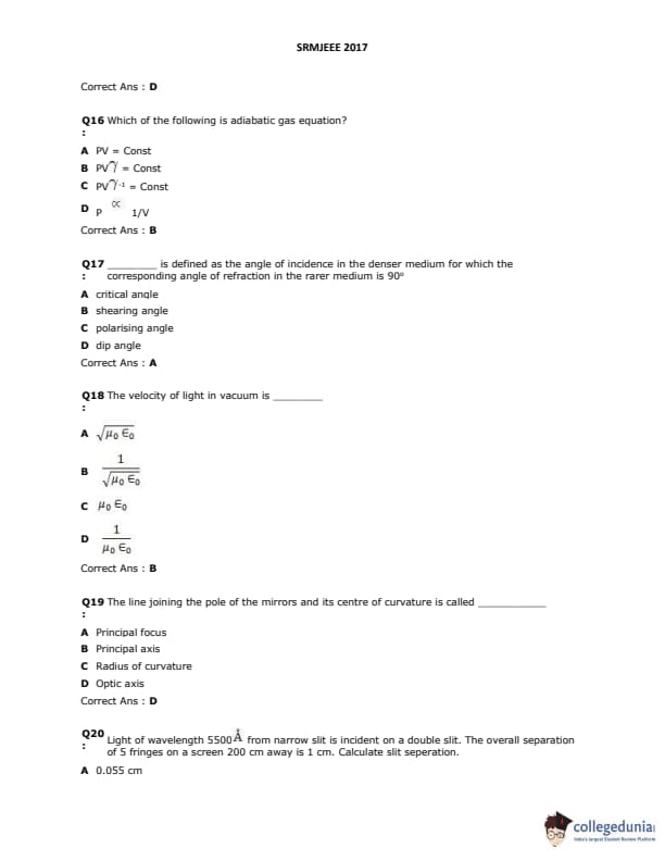 SRMJEEE 2017 Question Paper with Answer Key PDFs in English