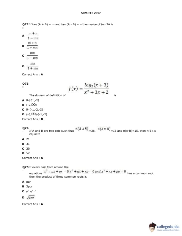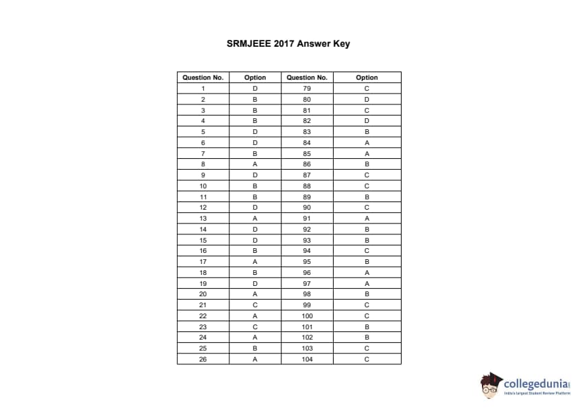 | SRMJEEE 2017 Question Paper PDF | SRMJEEE 2017 Answer Key PDF |
