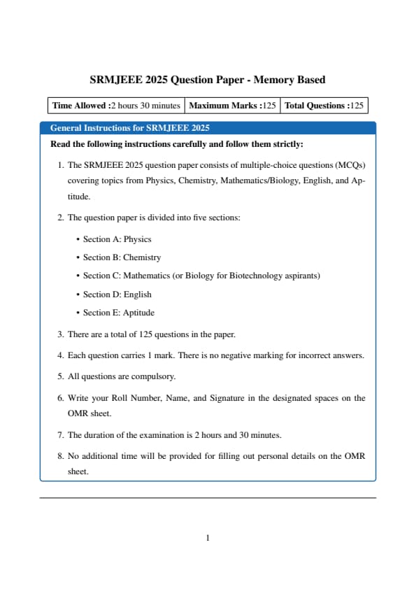 | SRMJEEE 2025 Model Question Paper with Answer Key | Download PDF | Check Solutions |