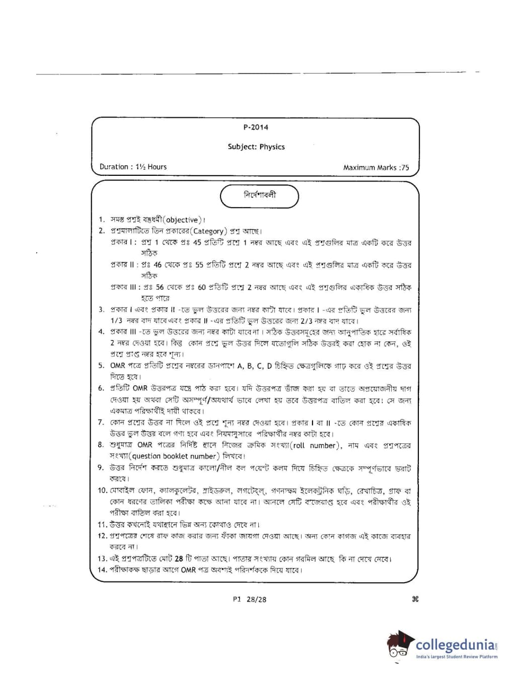 WBJEE 2014 Physics Question paper with answer key pdf conducted on Apr-20 in Afternoon Session is available for download. The exam was successfully organized by West Bengal Joint Entrance Examination Board (WBJEEB). The question paper comprised a total of 60 questions divided among Three sections.