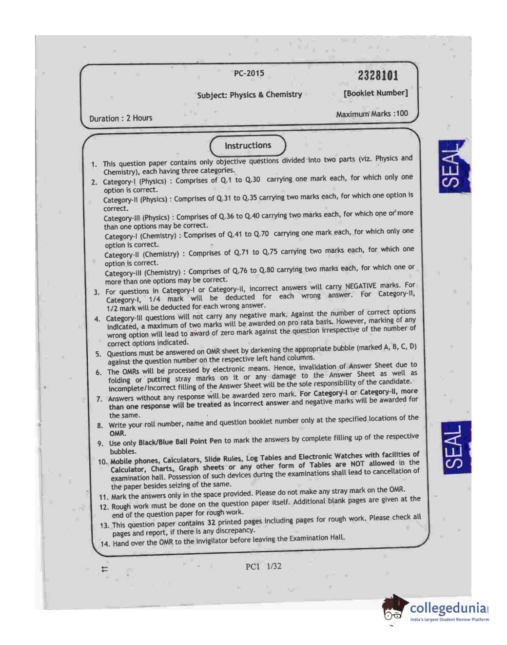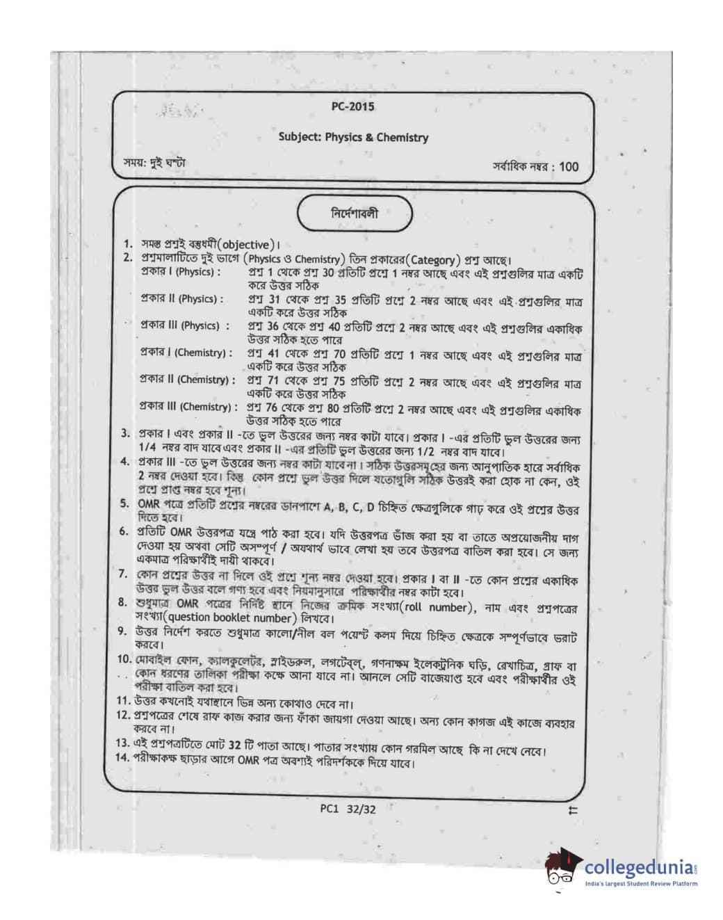WBJEE 2015 Physics & Chemistry Question Paper with Answer Key PDF for Afternoon Session