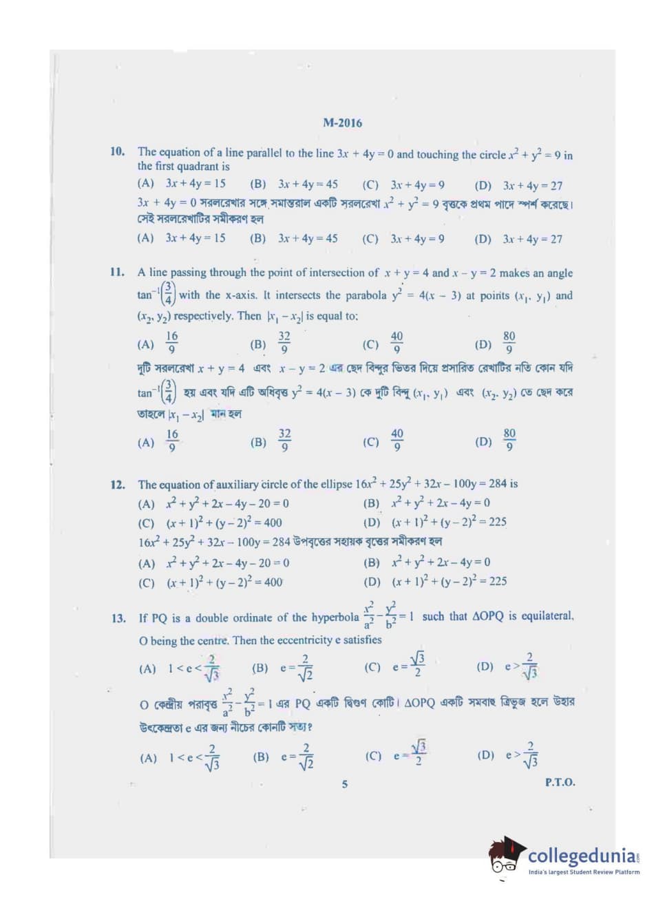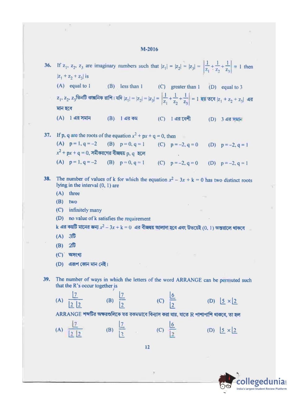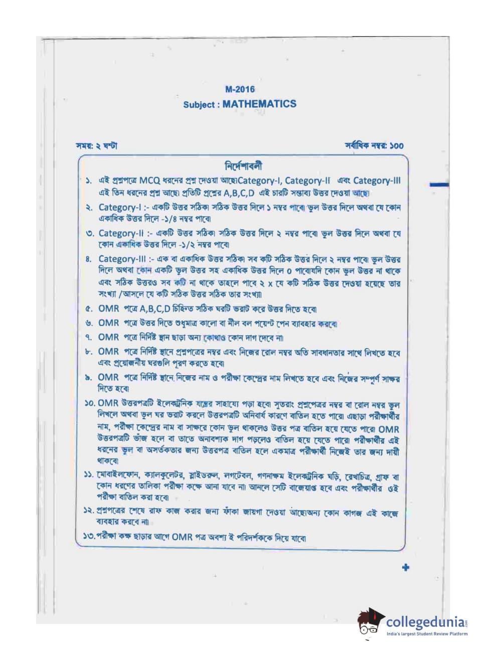 WBJEE 2016 Mathematics Question paper with answer key pdf conducted on May-17 in Forenoon Session is available for download. The exam was successfully organized by West Bengal Joint Entrance Examination Board (WBJEEB). In terms of difficulty level, WBJEE was of Easy level. The question paper comprised a total of 75 questions.