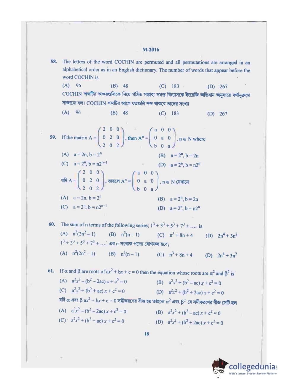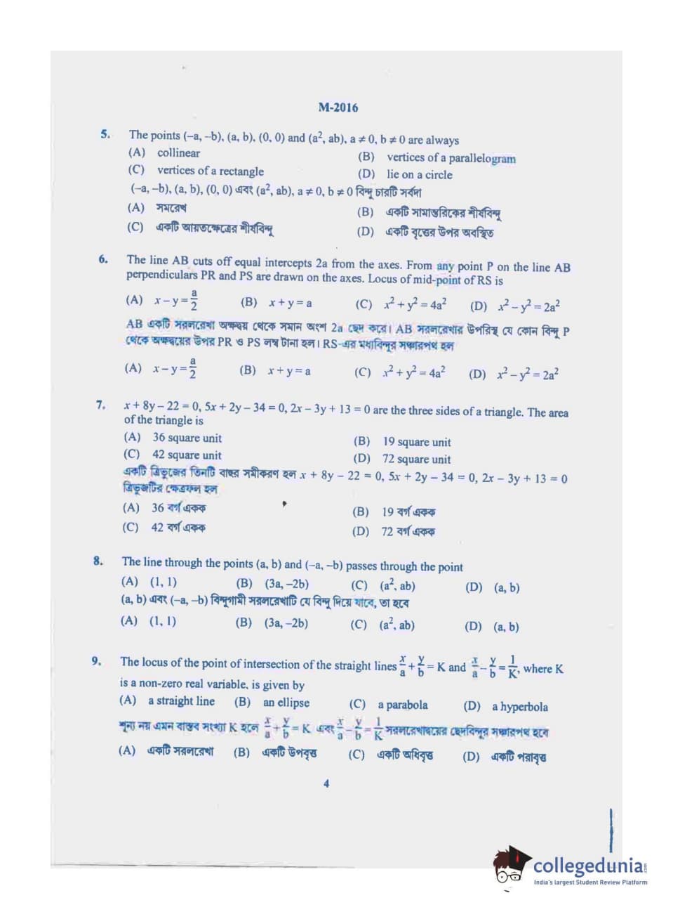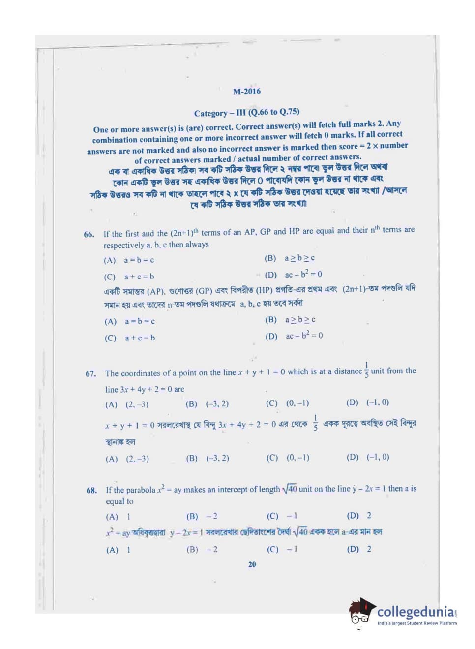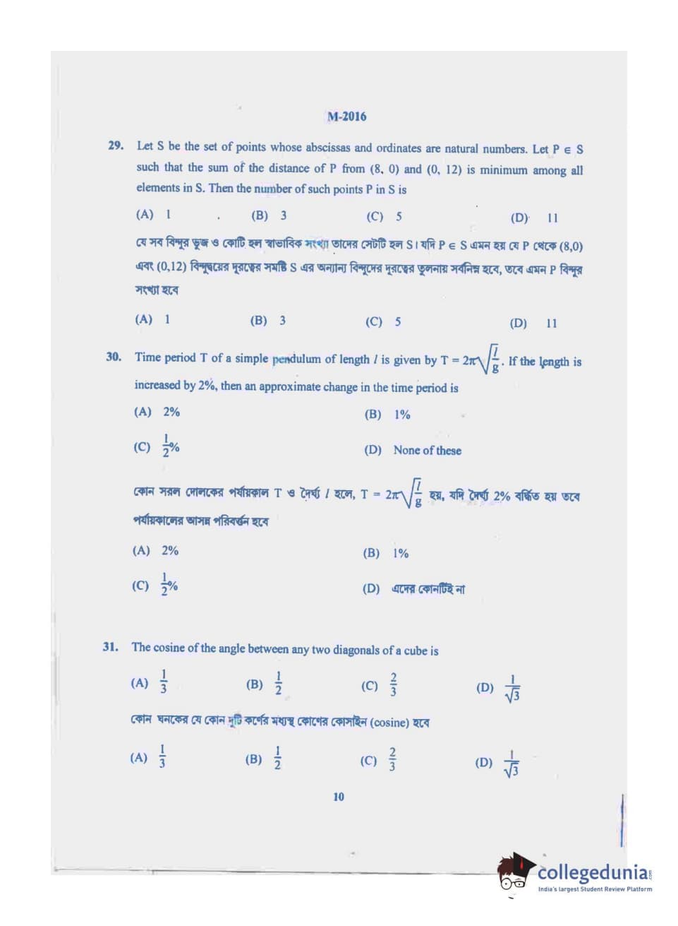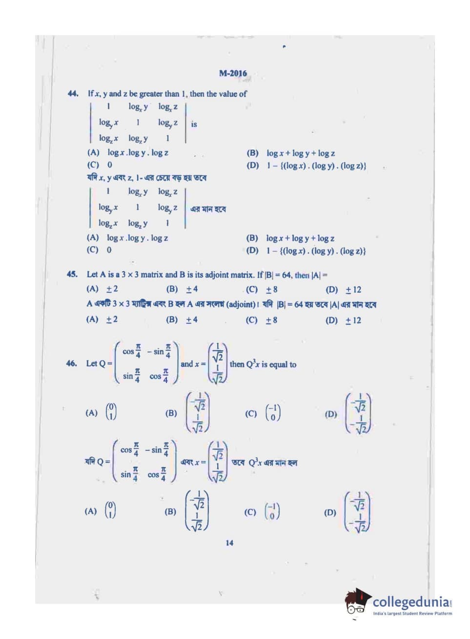 WBJEE 2016 Mathematics Question Paper with Answer Key PDF for Forenoon Session