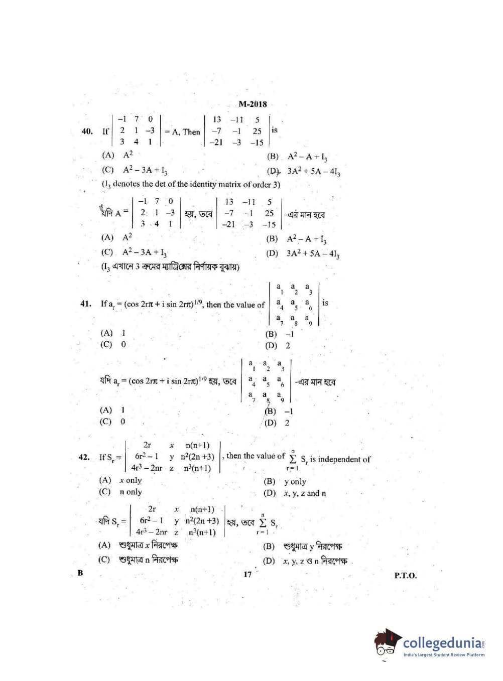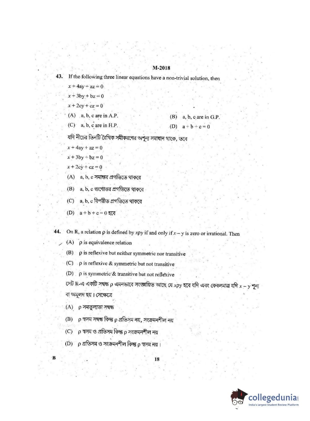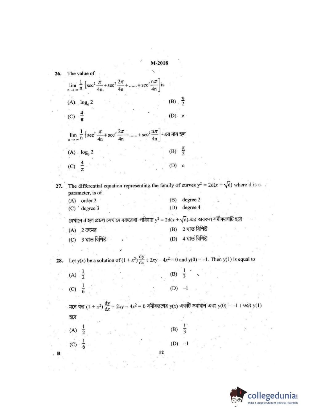 WBJEE 2018 Mathematics Question Paper with Answer Key PDF for Forenoon Session