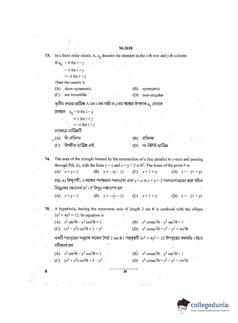 WBJEE 2018 Mathematics Question paper with answer key pdf conducted on Apr-22 in Forenoon Session is available for download. The exam was successfully organized by West Bengal Joint Entrance Examination Board (WBJEEB). In terms of difficulty level, WBJEE was of Easy level. The question paper comprised a total of 75 questions.