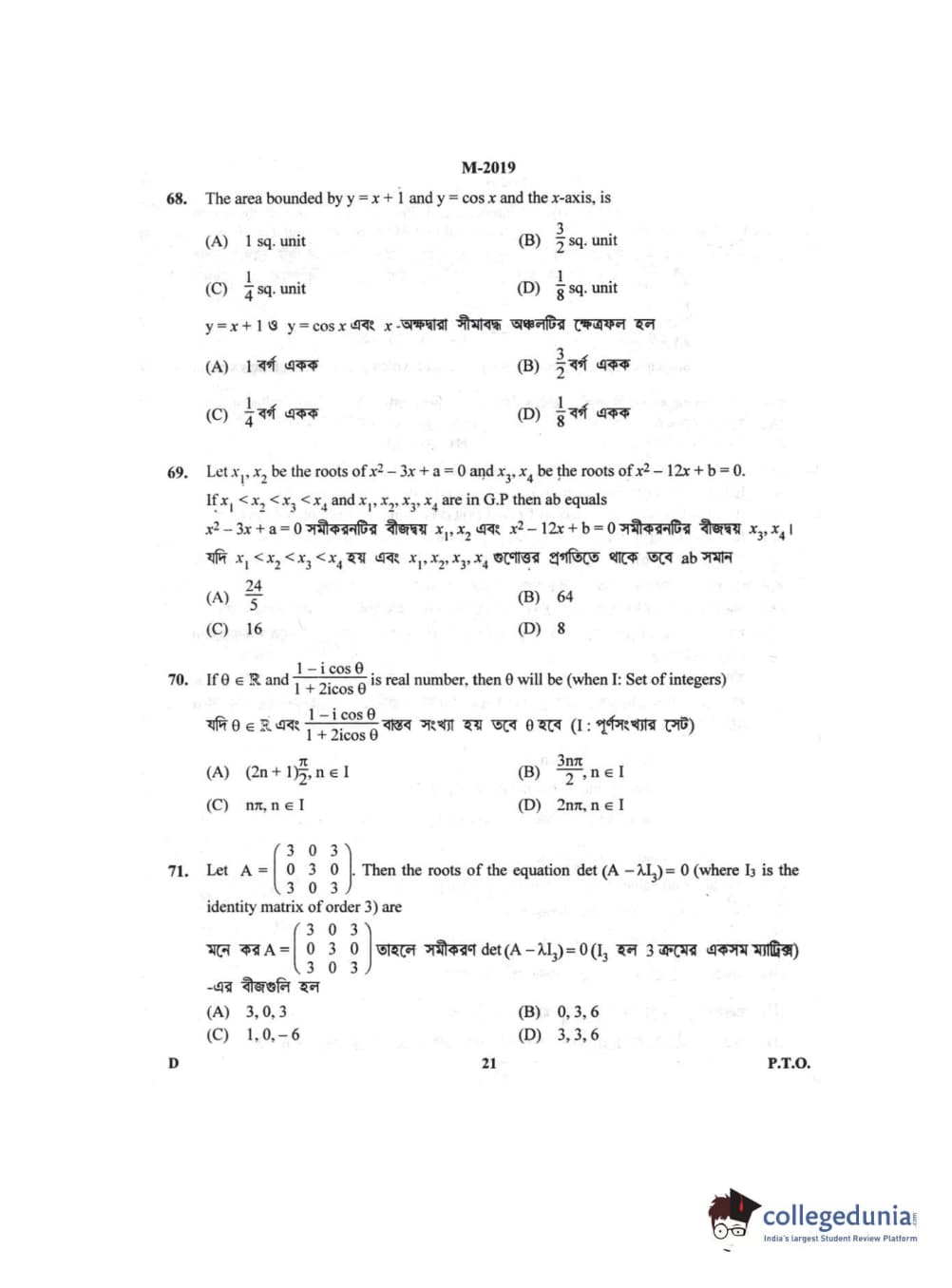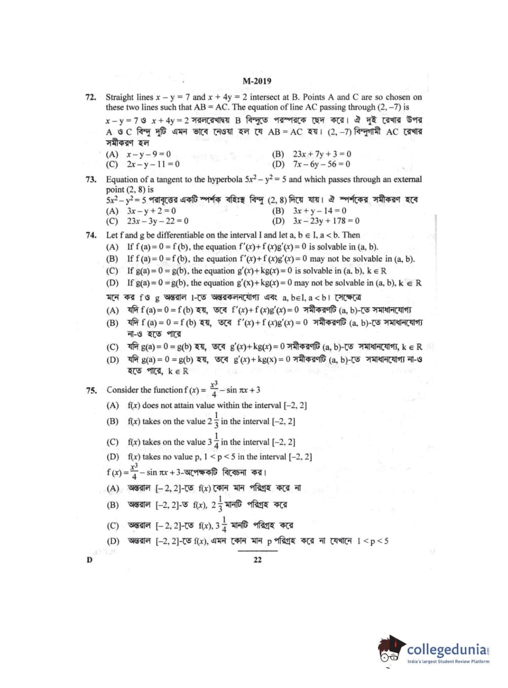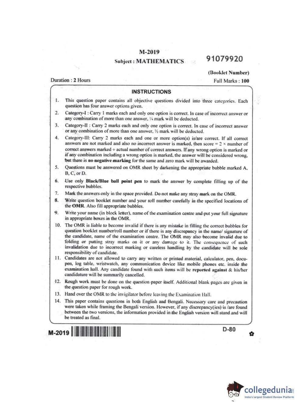 WBJEE 2019 Mathematics Question paper with answer key pdf conducted on May-26 in Forenoon Session is available for download. The exam was successfully organized by West Bengal Joint Entrance Examination Board (WBJEEB). In terms of difficulty level, WBJEE was of Easy to Moderate level. The question paper comprised a total of 75 questions.