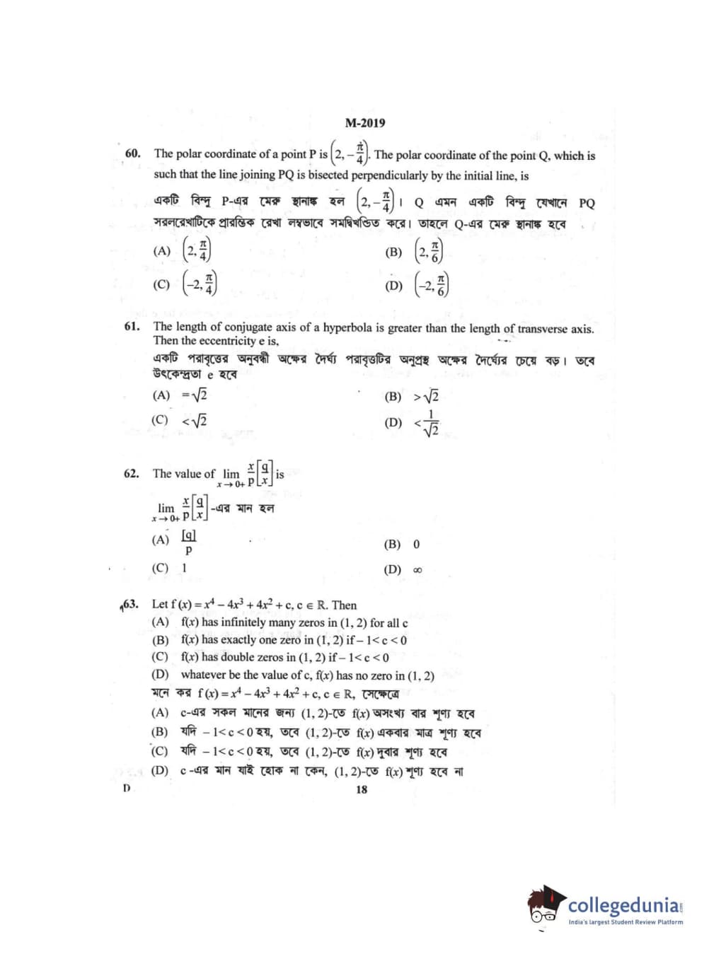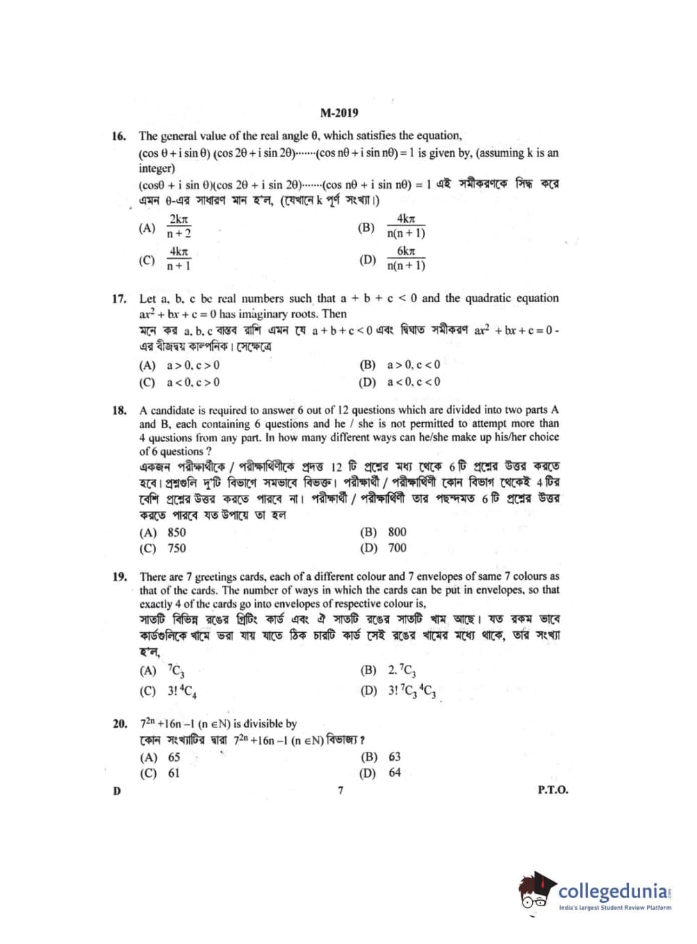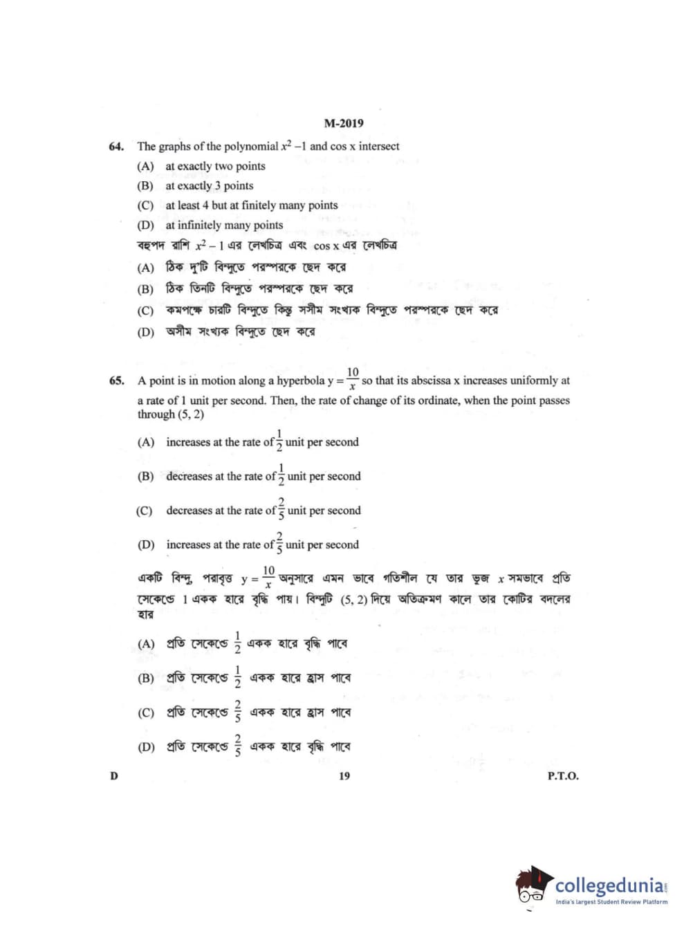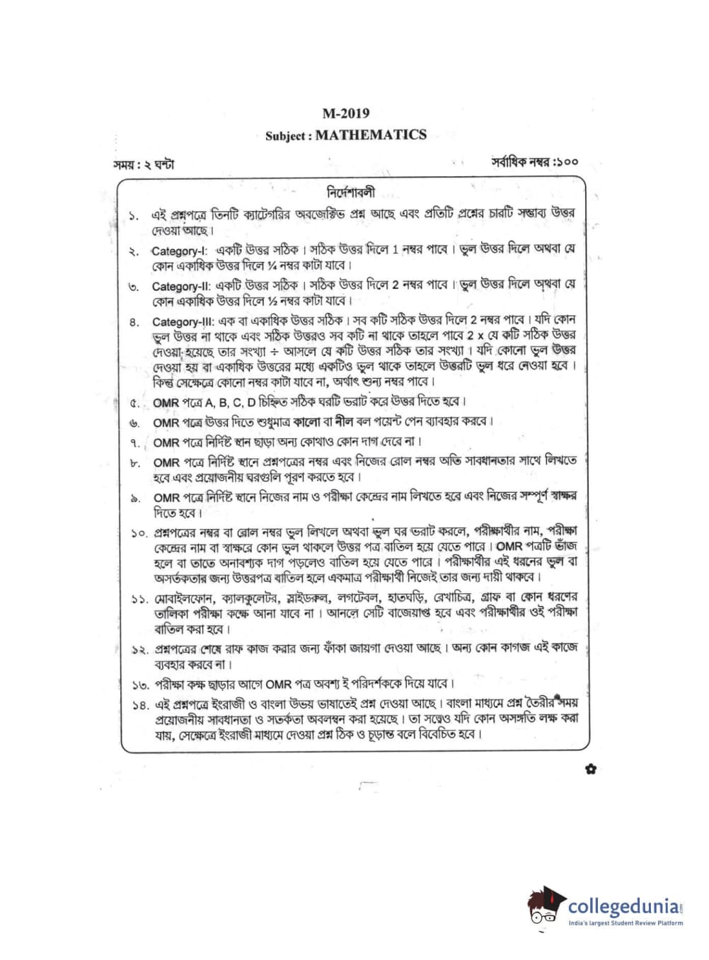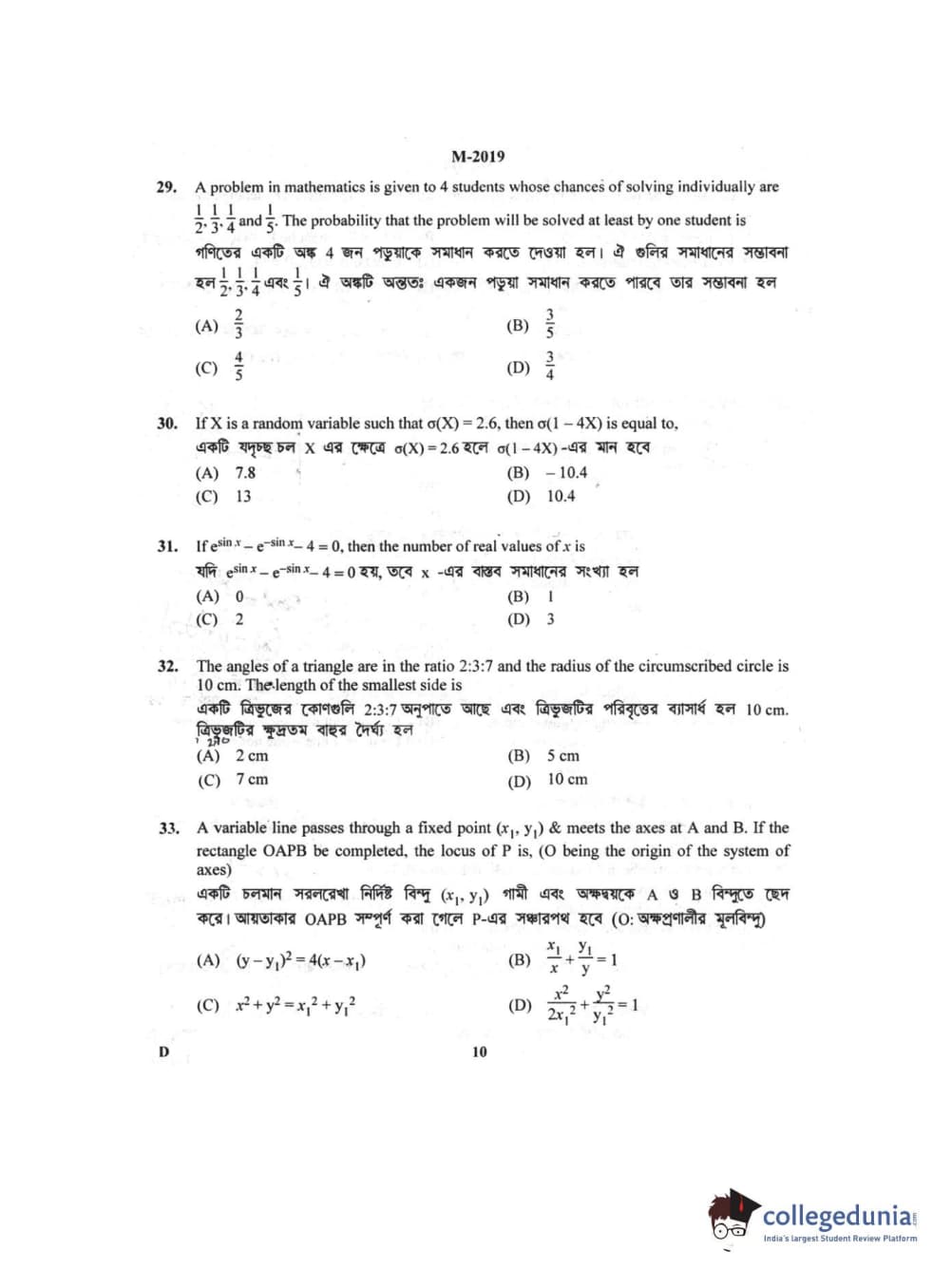 WBJEE 2019 Mathematics Question Paper with Answer Key PDF for Forenoon Session