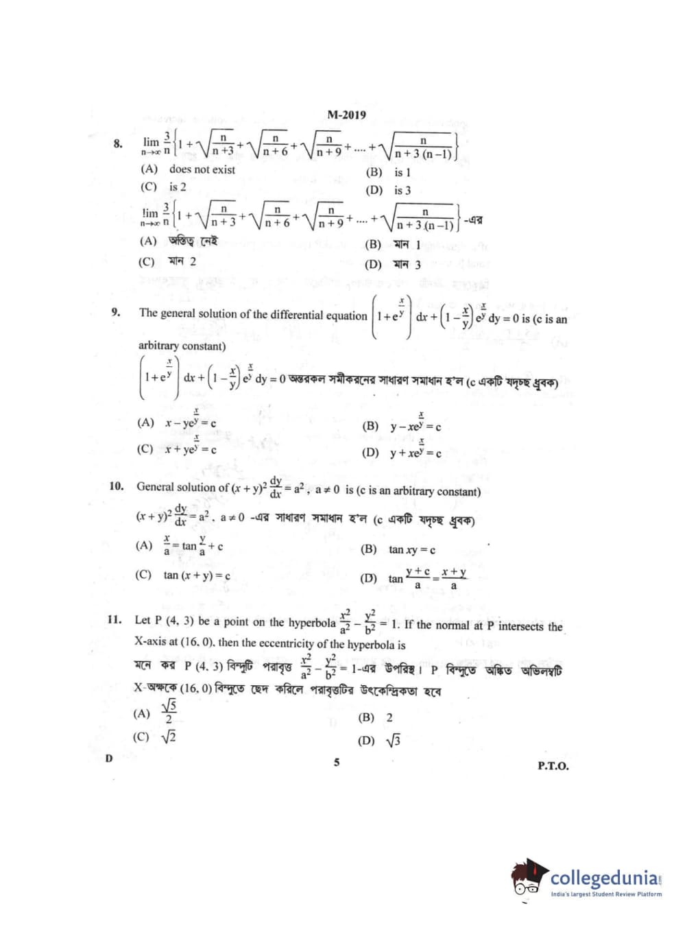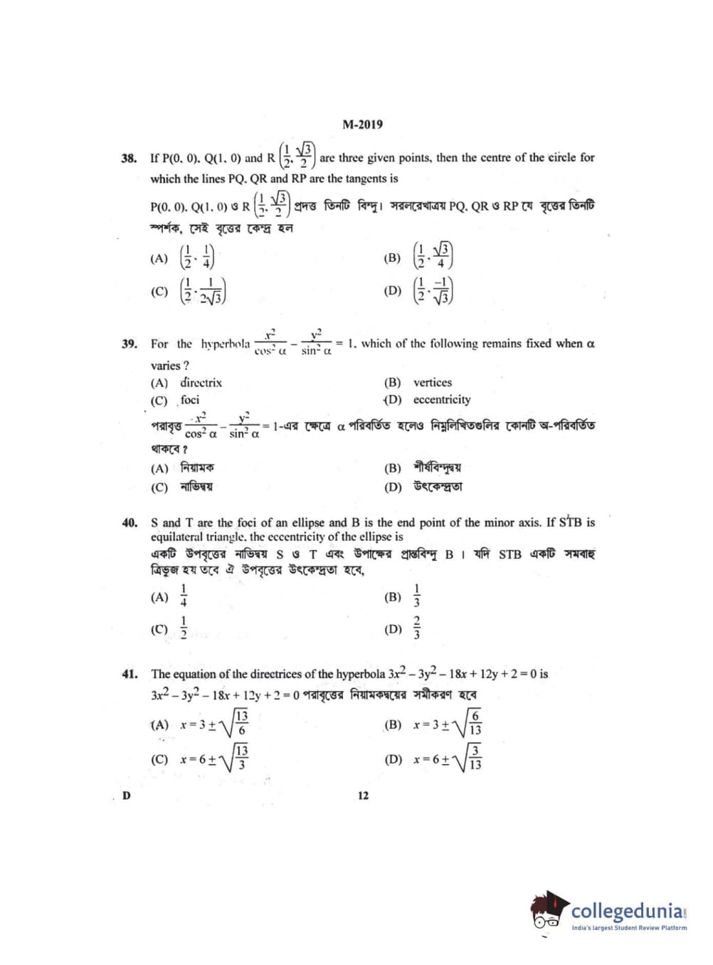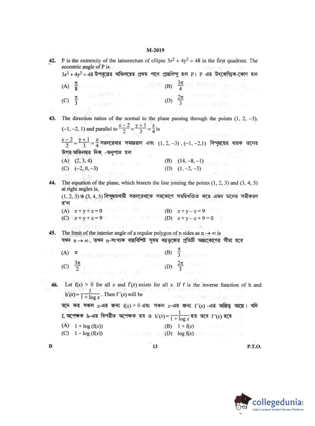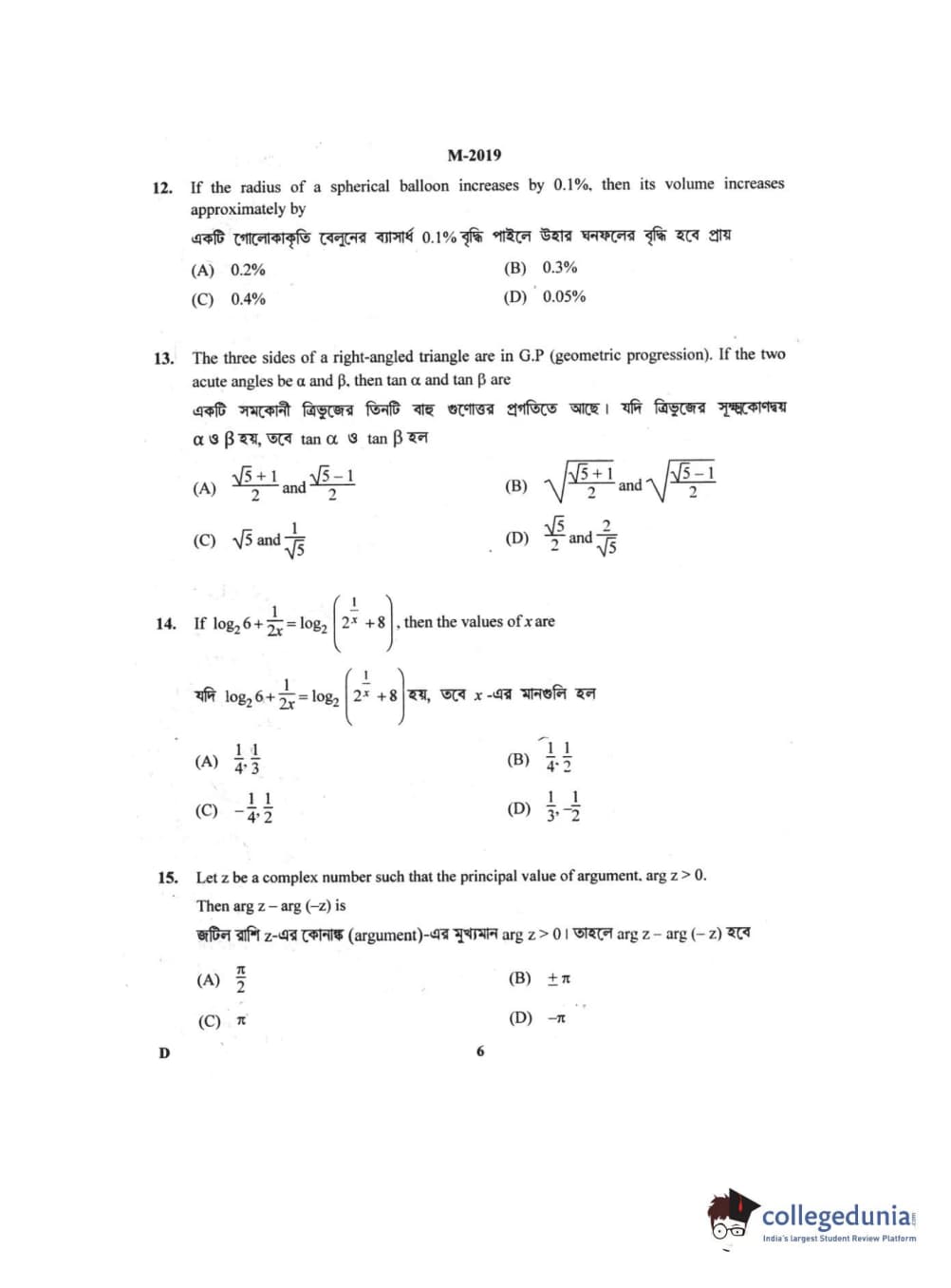 WBJEE 2019 Mathematics Question Paper with Answer Key PDF for Forenoon Session