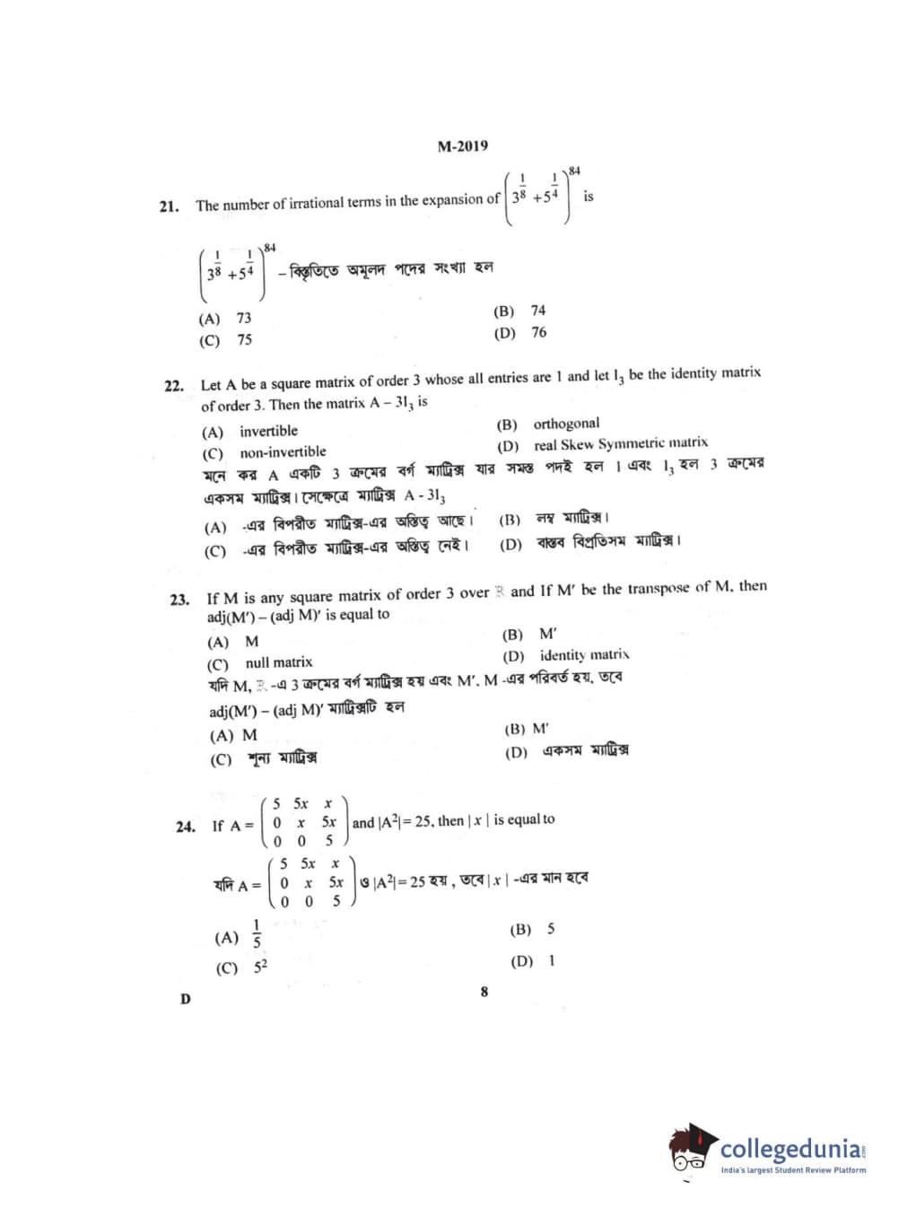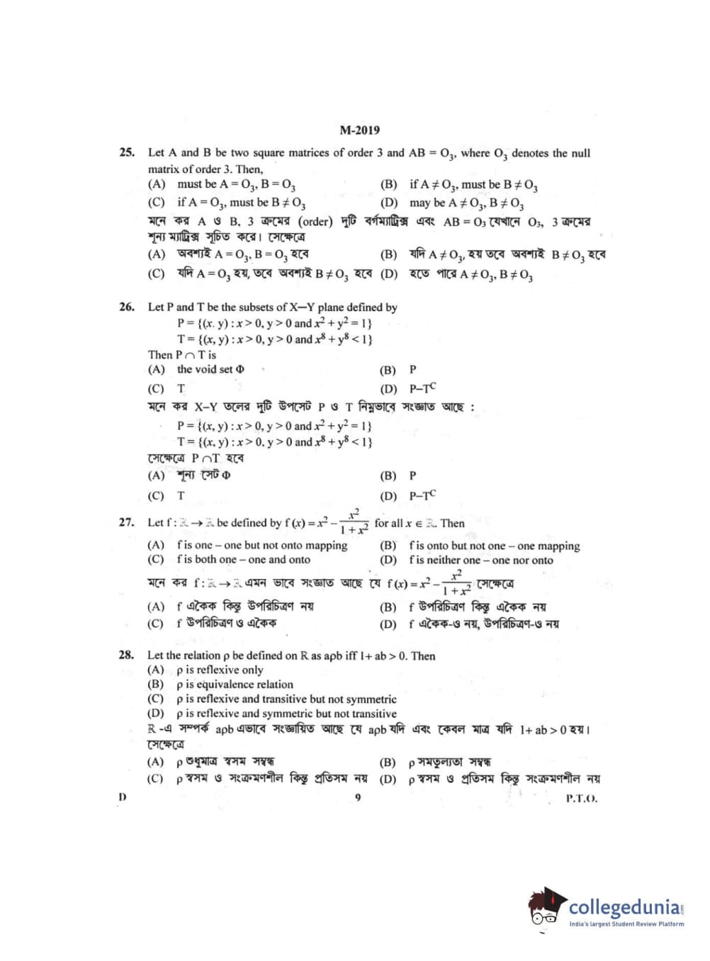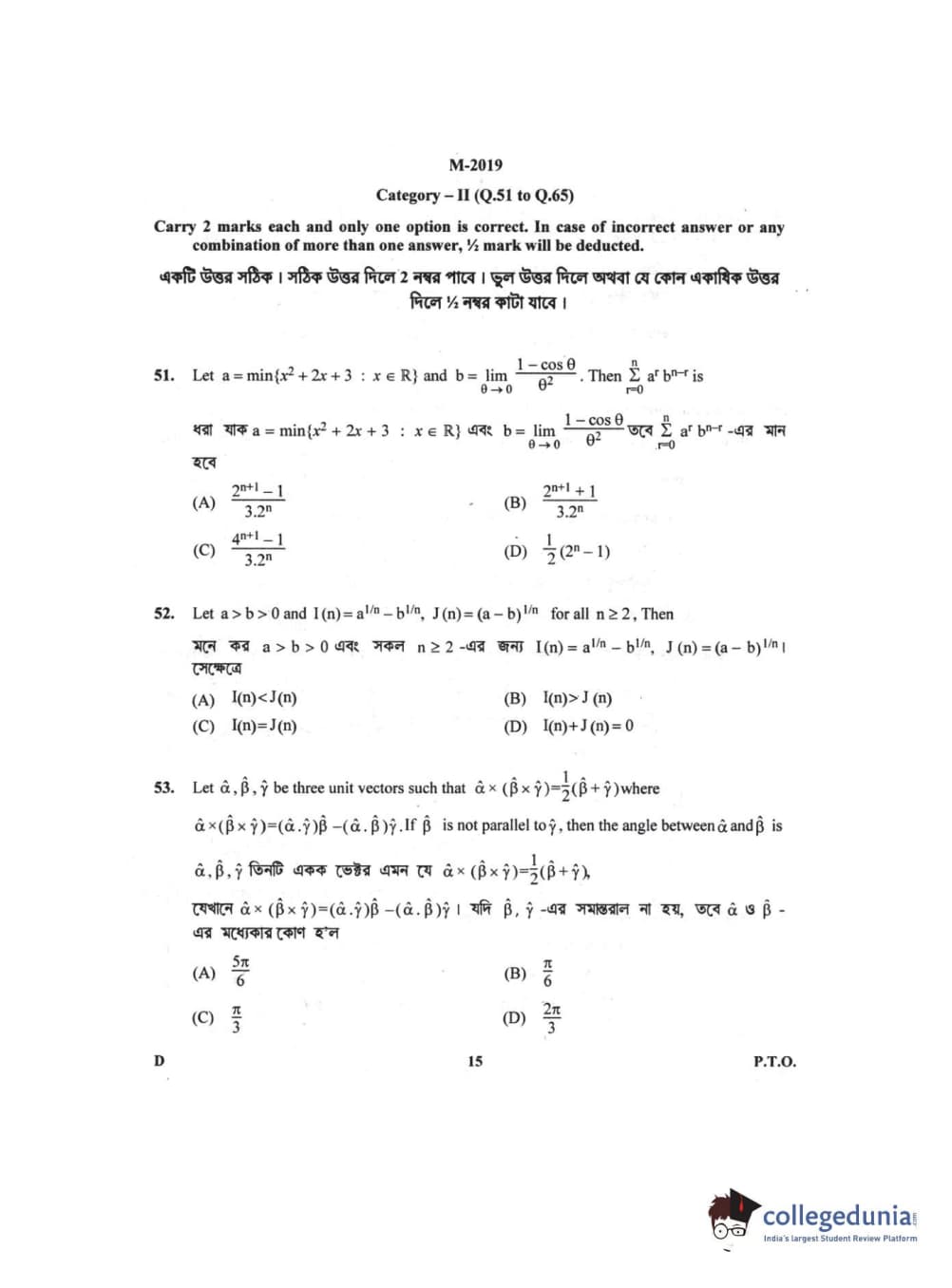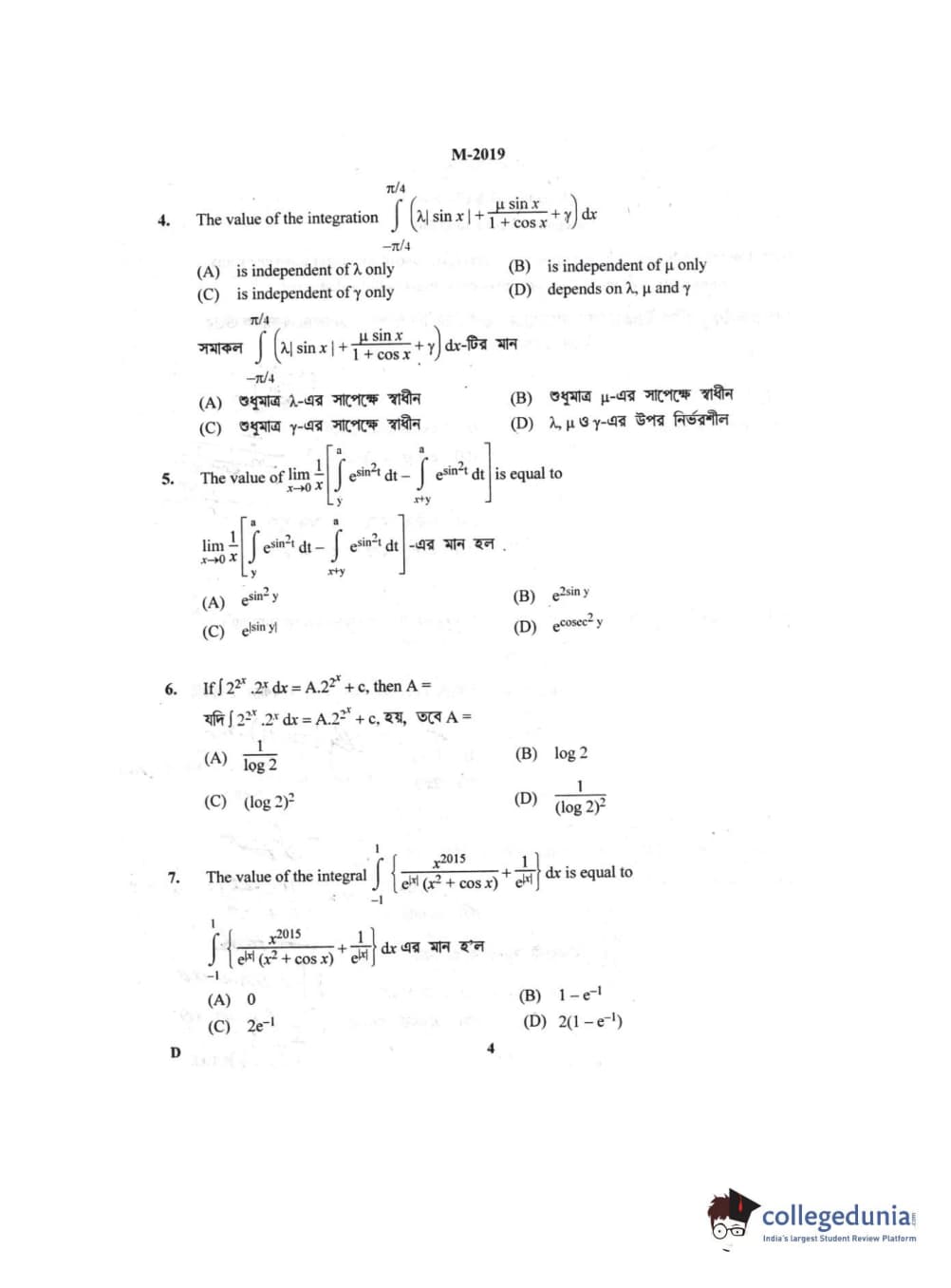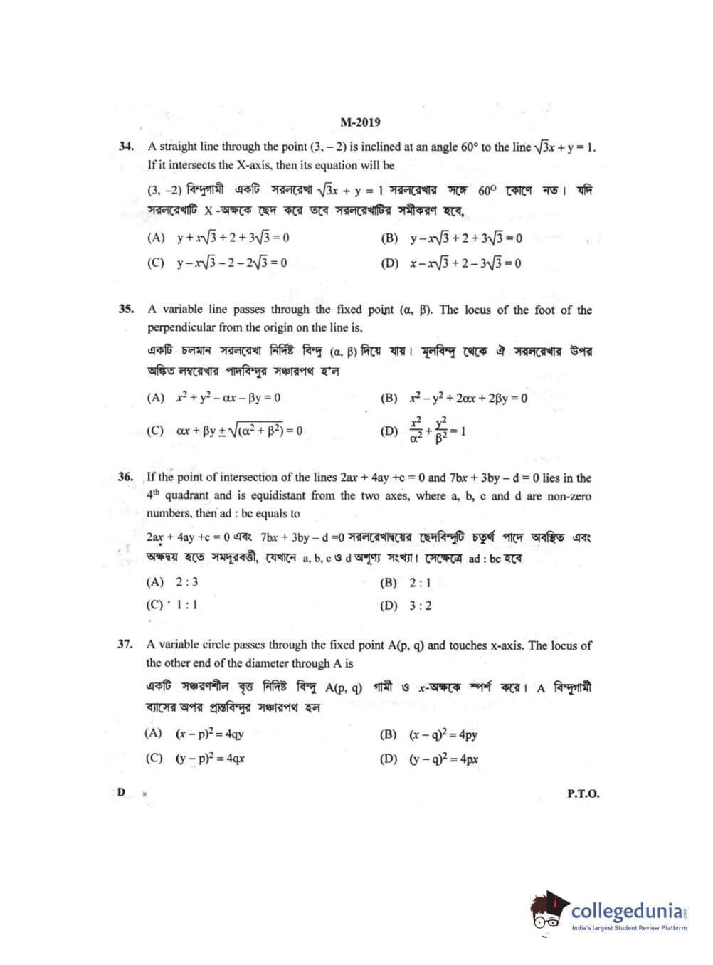 WBJEE 2019 Mathematics Question Paper with Answer Key PDF for Forenoon Session