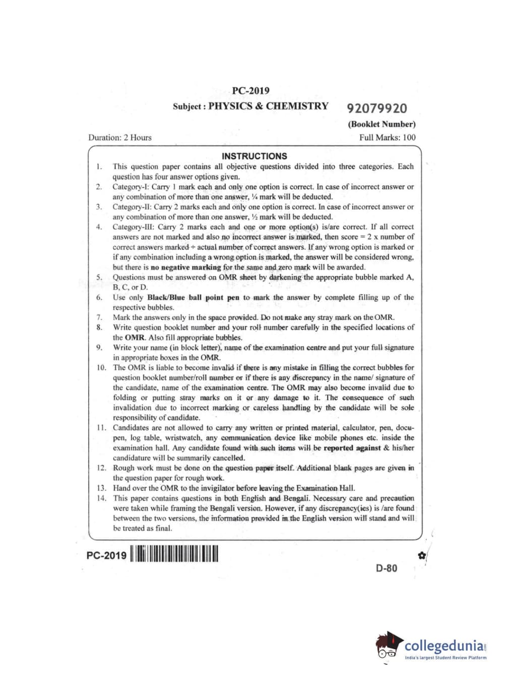 WBJEE 2019 Physics & Chemistry Question paper with answer key pdf conducted on May-26 in Afternoon Session is available for download. The exam was successfully organized by West Bengal Joint Entrance Examination Board (WBJEEB). In terms of difficulty level, WBJEE was of Easy to Moderate level. The question paper comprised a total of 80 questions divided among Two sections.