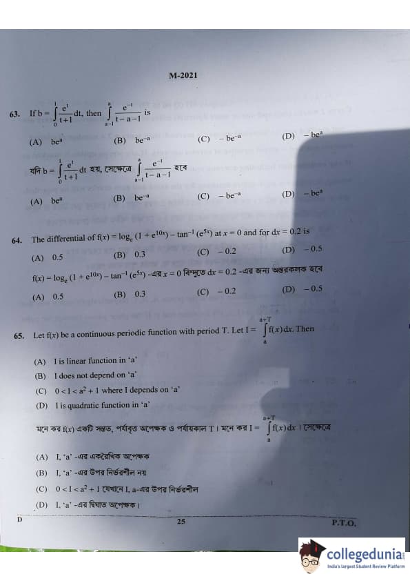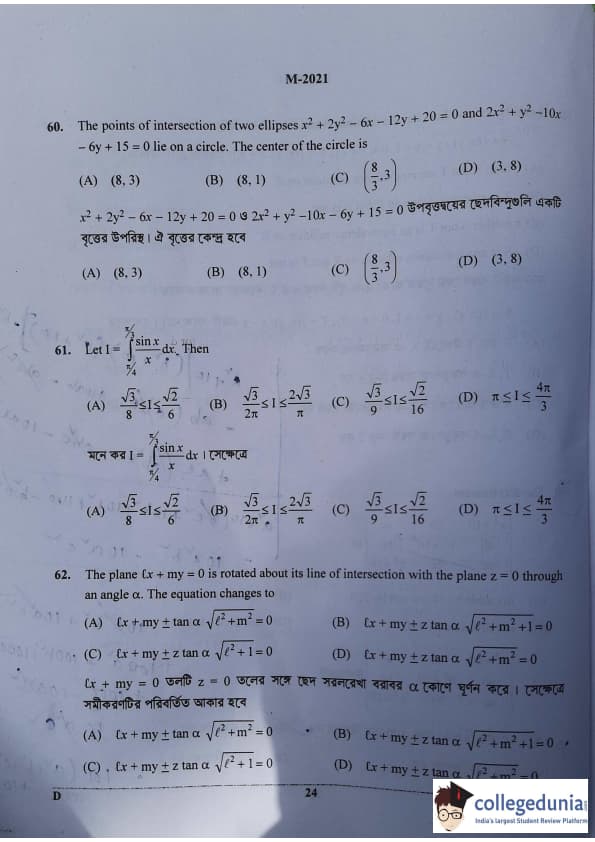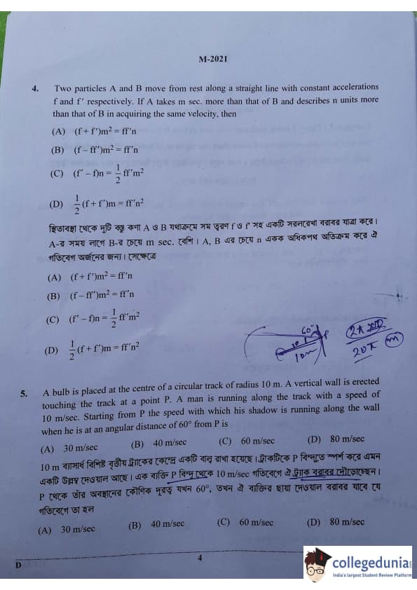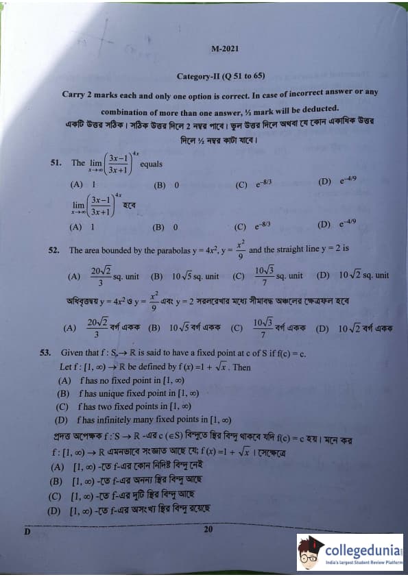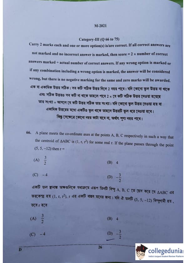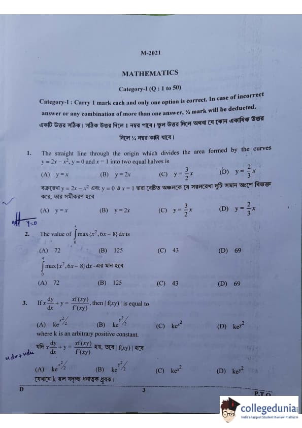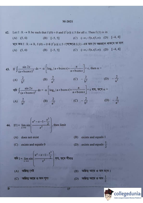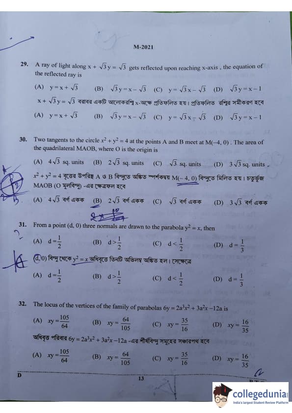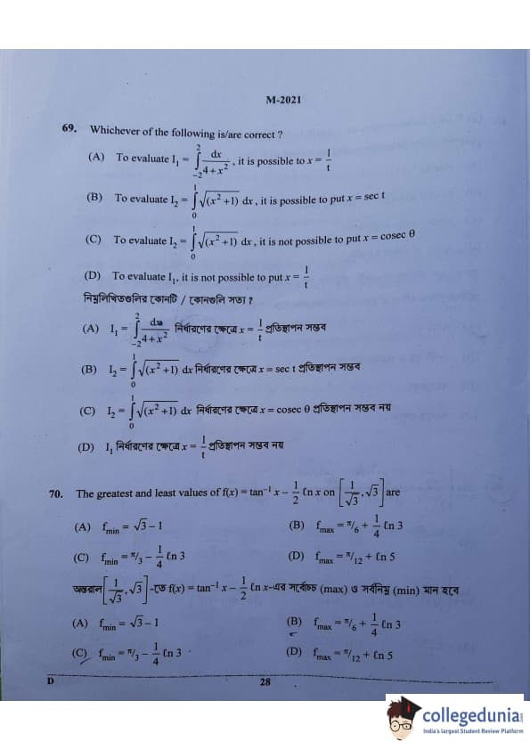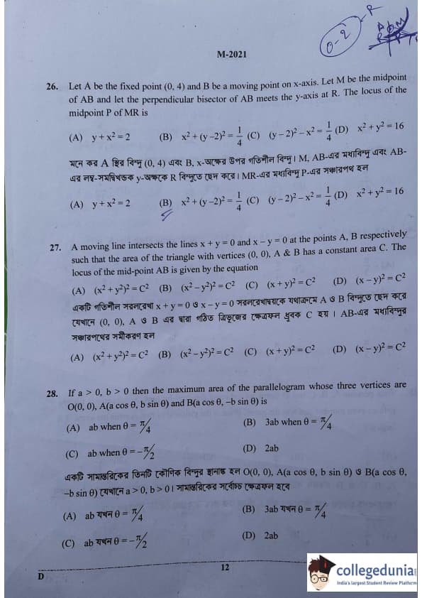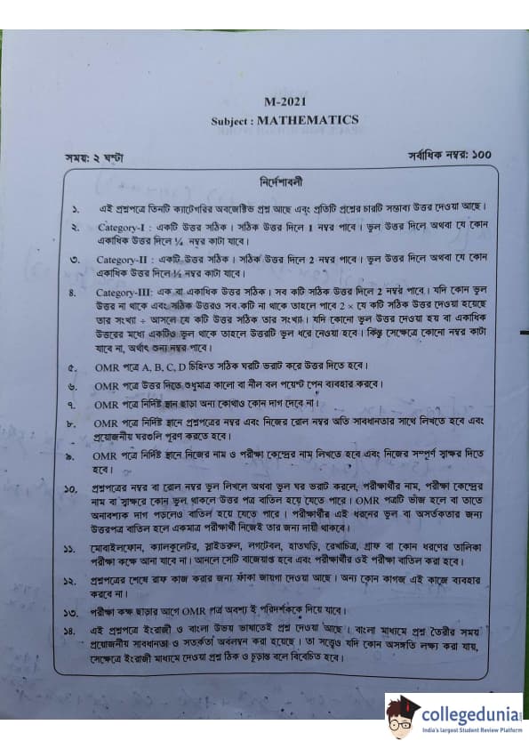WBJEE 2021 Mathematics Question paper with answer key pdf conducted on Jul-17 in Forenoon Session for Set D is available for download. The exam was successfully organized by West Bengal Joint Entrance Examination Board (WBJEEB). In terms of difficulty level, WBJEE was of Moderate level. The question paper comprised a total of 75 questions.