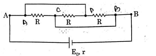 Consider a circuit where a cell of emf E₀ and internal resistance r is connected across the terminal A and B as shown in the figure. The value of R for which the power generated in the circuit is maximum is given by: