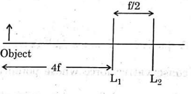 Two convex lenses (L1 and L2) of equal focal length f are placed at a distance f/2 apart. An object is placed at a distance 4f to the left of L1. The final image is at: