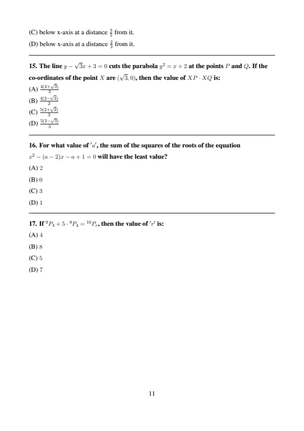 The line \( y - \sqrt{3}x + 3 = 0 \) cuts the parabola \( y^2 = x + 2 \) at the points \( P \) and \( Q \). If the co-ordinates of the point \( X \) are \( (\sqrt{3}, 0) \), then the value of \( XP \cdot XQ \) is: