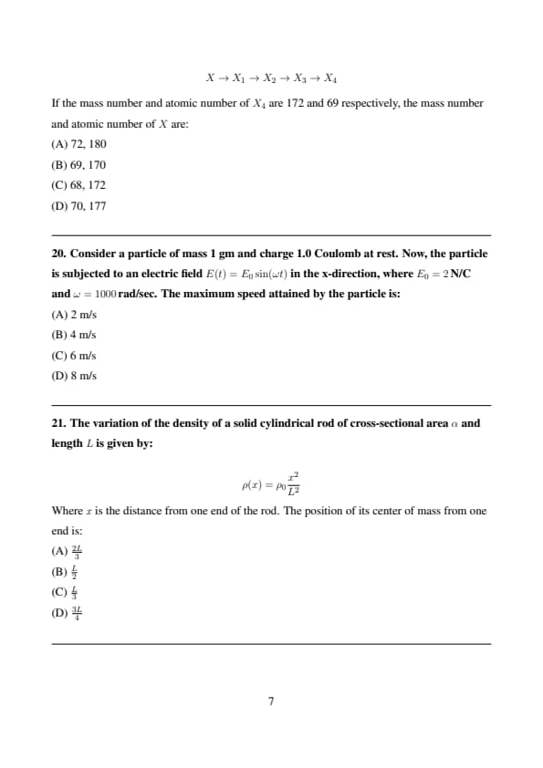 Consider a particle of mass 1 gm and charge 1.0 Coulomb at rest. Now, the particle is subjected to an electric field \( E(t) = E_0 \sin(\omega t) \) in the x-direction, where \( E_0 = 2 \, N/C \) and \( \omega = 1000 \, rad/sec \). The maximum speed attained by the particle is: