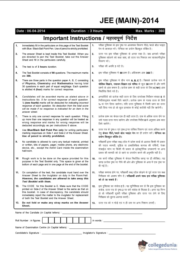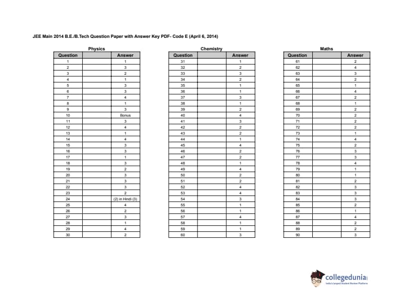 JEE Main 2014 B.E./B.Tech Question Paper (Code E) with Answer Key PDF was successfully conducted on April 6, 2014. The exam was held by CBSE. JEE Main 2014 B.E./B.Tech Question Paper with Answer Key- Code E for April 6 included 42 questions from class 11th and 48 questions from class 12th syllabus. The physics paper was of moderate difficulty level; the Chemistry paper had some easy questions, while the maths paper was lengthy but not that tough.
