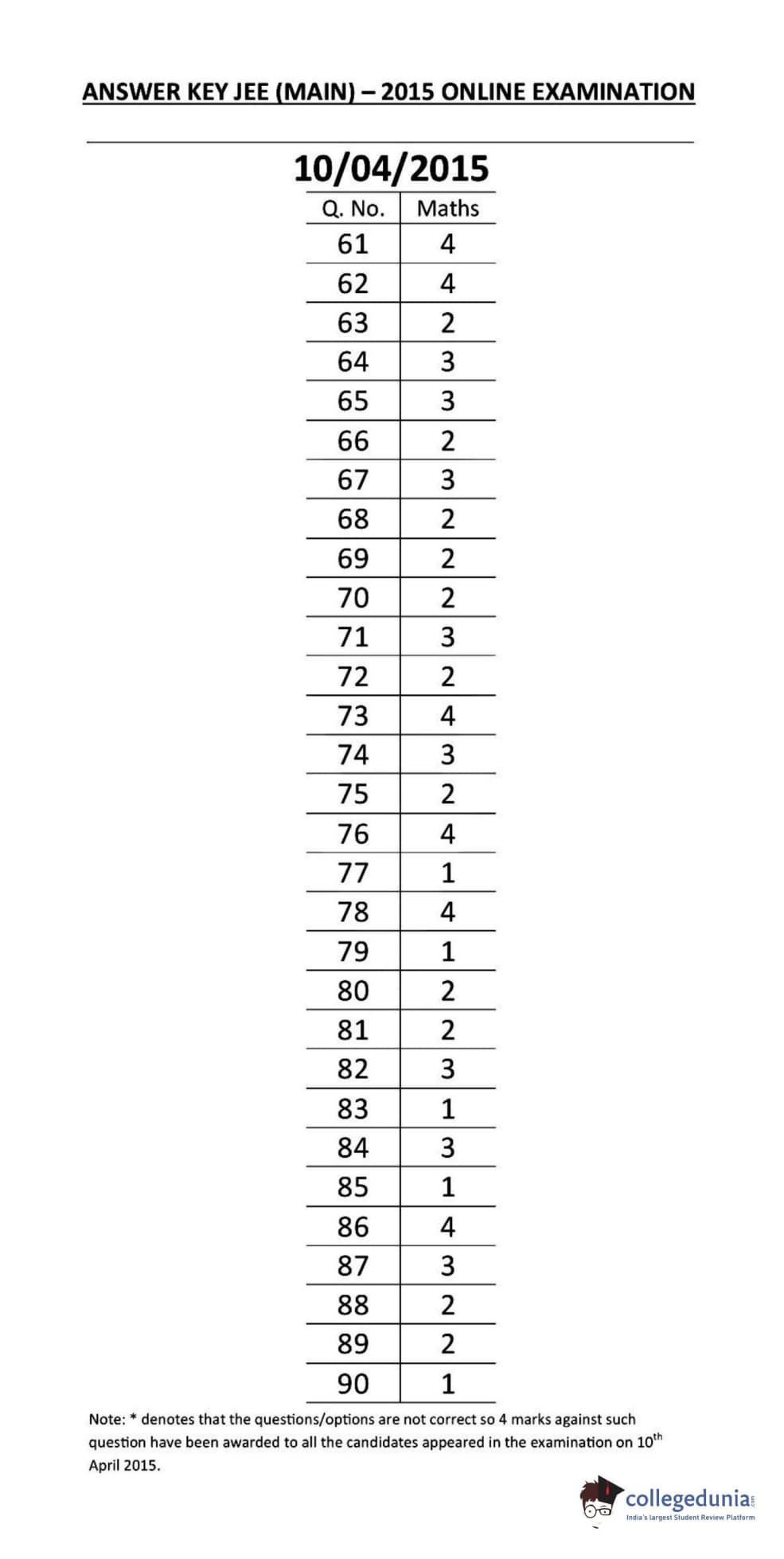 JEE Main 2015 B.E./B.Tech Question Paper with Answer Key PDF conducted on April 10, 2015, in an online mode is available for download. JEE Main 2015 was successfully conducted by NTA. JEE Main 2015 B.E./B. Tech exam had a moderate level of difficulty level, similar to the offline paper held on April 4, 2015. There were 90 questions carrying 4 marks each. Physics was slightly difficult compared to Mathematics and Chemistry was the easiest.