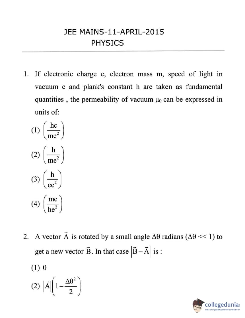 JEE Main 2015 B.E./B.Tech Question Paper with Answer key PDF conducted online on April 11, 2015 is available for download. This was the first time that JEE Main was held online by CBSE. Students rated the JEE Main 2015 B.E/B.Tech Question Paper for April 11 as moderate, with Math and Physics being the most difficult sections and Chemistry being the easiest.