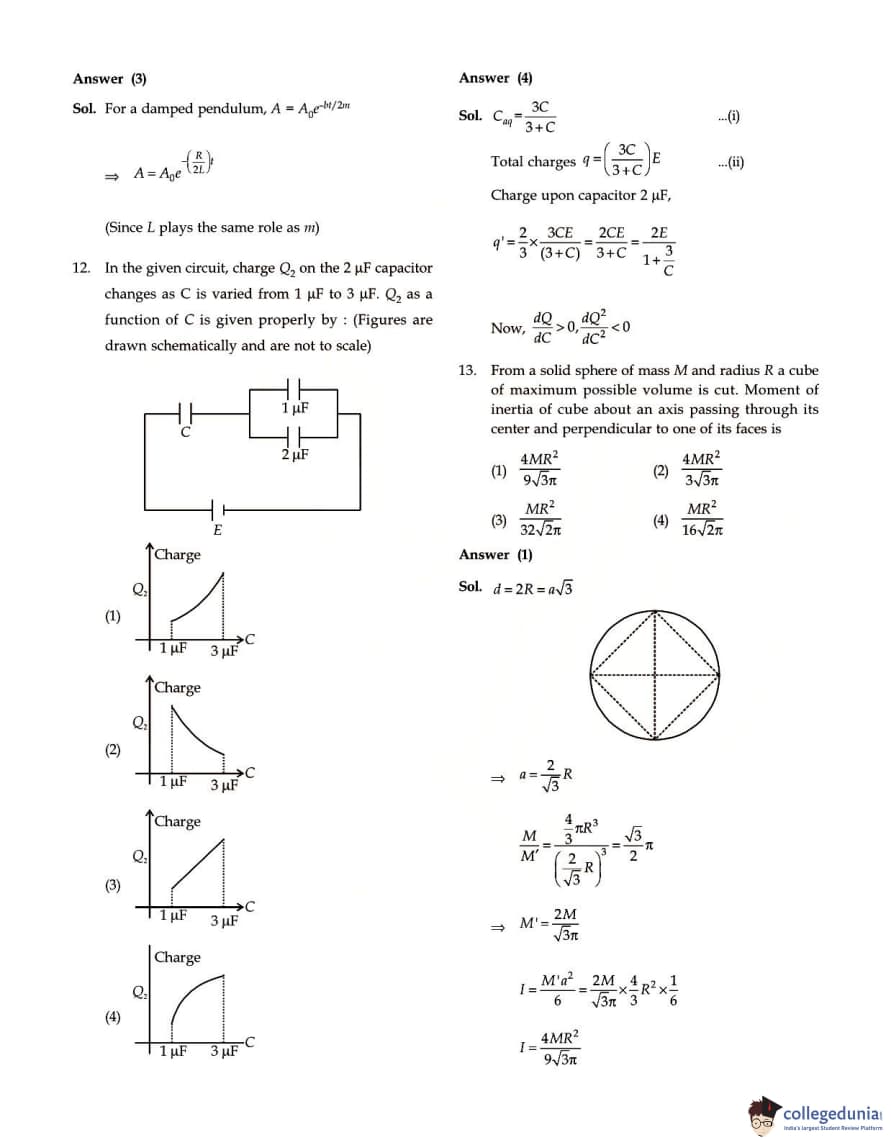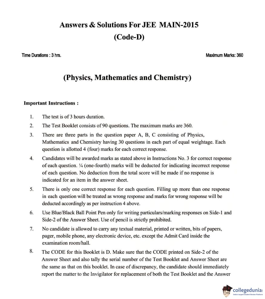 JEE Main 2015 B.E./B.Tech Question Paper with Answer Key- Code D for the exam conducted on April 4 in the Morning Session (9:30 AM to 12:30 PM) is available for download. The exam was successfully organized by CBSE (Central Board of Secondary Education). In terms of difficulty level, JEE Main B.E./B.Tech question paper was of moderate level. The question paper comprised a total of 90 questions divided among three main sections i.e Physics, Chemistry and Mathematics.