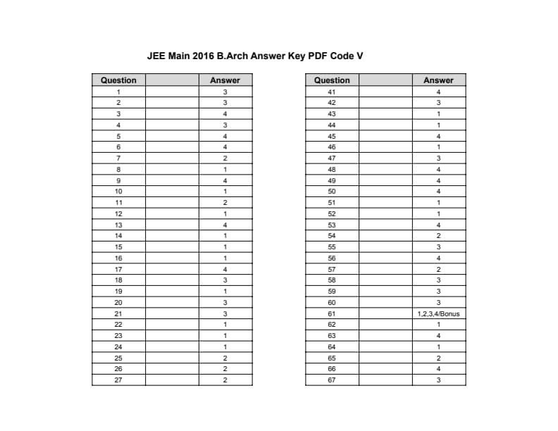 JEE Main 2016 Question paper with Answer key PDF Conducted on April 3 is available for download. The exam was successfully organized by Central Board Of Secondary Education (CBSE). In terms of difficulty level, B.Arch was of Moderate to difficulty level. The question paper comprised a total of 80 questions divided among three main sections i.e Mathematics, Aptitude and Drawing.