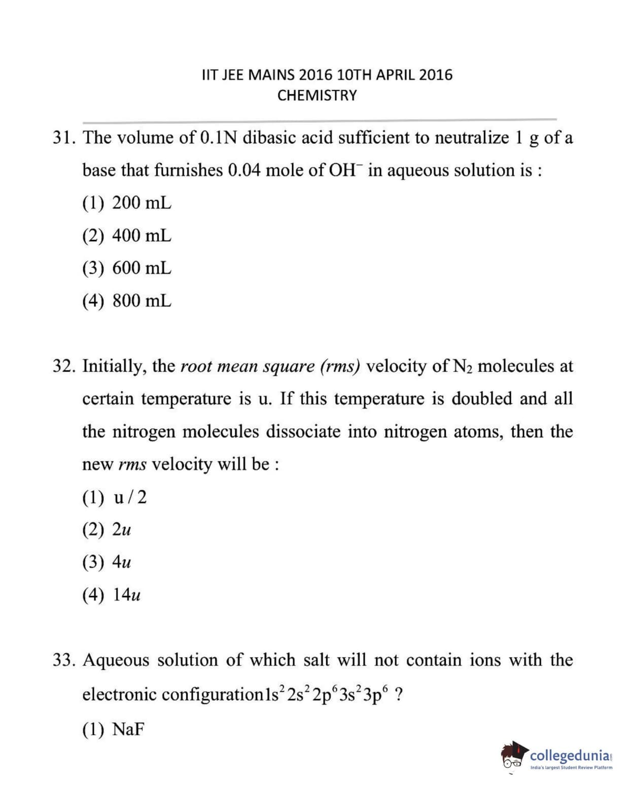 JEE Main B.E./B.Tech 2016 Question Paper with Answer Key PDF- April 10 (Online Mode)