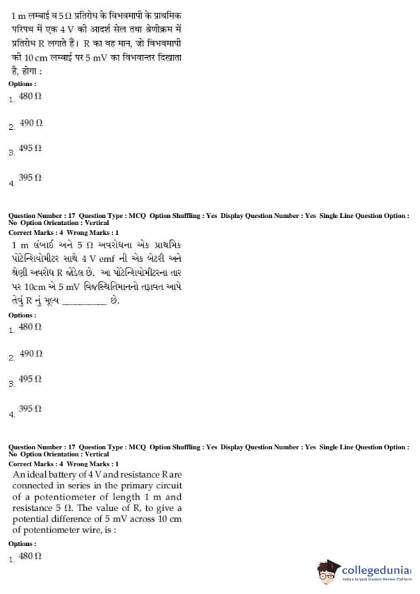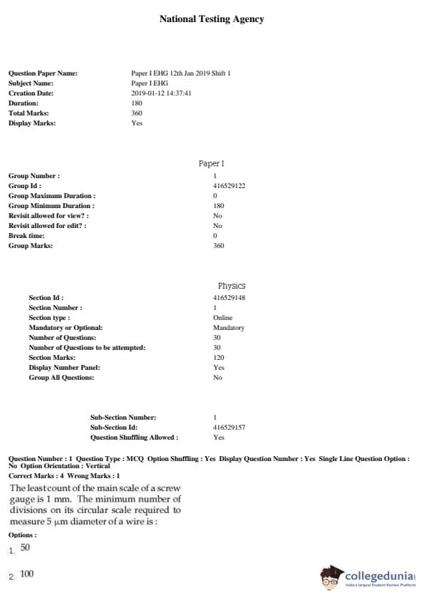 JEE Main 2019 B.E./B.Tech Question Paper- January 12 (Forenoon)