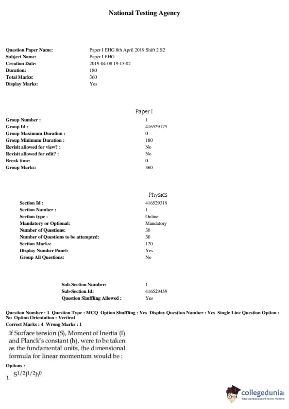 JEE Main B.E./B.Tech 2019 Question Paper with Answer Key PD- April 08 (Afternoon Session)