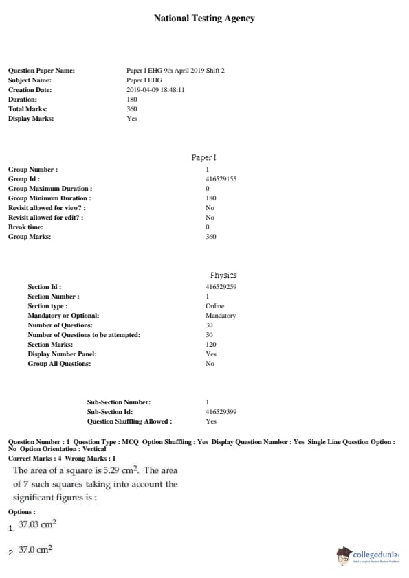 JEE Main 2019 B.E./B.Tech Question Paper- April 9(Afternoon)