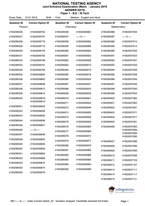 | JEE Main 2019 Question Paper | JEE Main 2019 Answer Key |