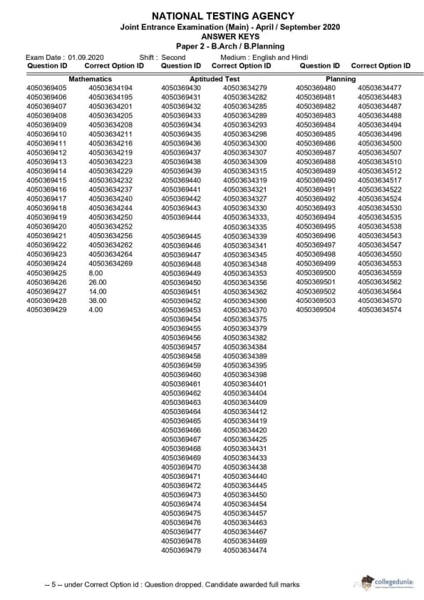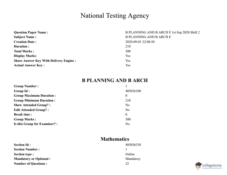 JEE Main 2020 Question paper with Answer key PDF Conducted on September 1 is available for download. The exam was successfully organized by National Testing Agency (NTA). In terms of difficulty level, B.Arch & B.Planning was of Moderate to difficult level. The question paper comprised a total of 102 questions.