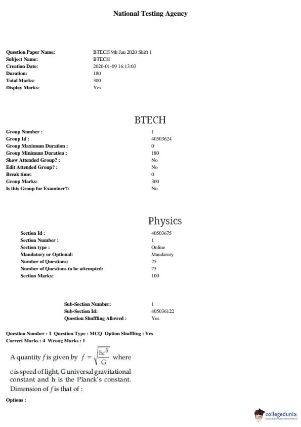 JEE Main B.E./B.Tech Question Paper- January 9, 2020 Shift 1