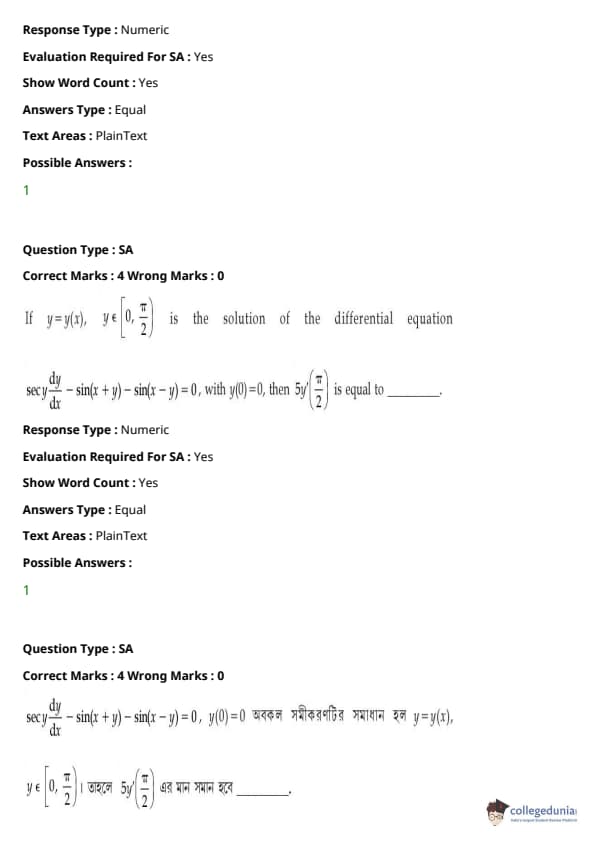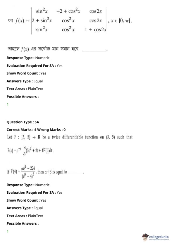 JEE Main 2021 BE / B.Tech প্রশ্নাবলী- 27 জুলাই, 2021- সকালের বিশেষজ্ঞ কোচিং ইনস্টিটিউটগুলি পরীক্ষাটিকে মাঝারিভাবে কঠিন বলে মনে করে। এই পরীক্ষাটি JEE Main তৃতীয় সেশনের দ্বিতীয় পরীক্ষা। বিশেষ করে সম্ভাব্যতা এবং ডিফারেনশিয়াল গণনা থেকে। দ্বিতীয় সবচেয়ে কঠিন পদার্থবিদ্যা বিভাগ, যা মেকানিক্স এবং আধুনিক পদার্থবিদ্যা থেকে উল্লেখযোগ্য প্রশ্ন অন্তর্ভুক্ত করে।) JEE Main 2022, 27 জুলাই 2021-এর জন্য প্রস্তুতি নিচ্ছেন প্রার্থীরা নীচে থেকে সকালের সেশনের প্রশ্নপত্র সহ উত্তর কী PDF ডাউনলোড করতে পারেন: