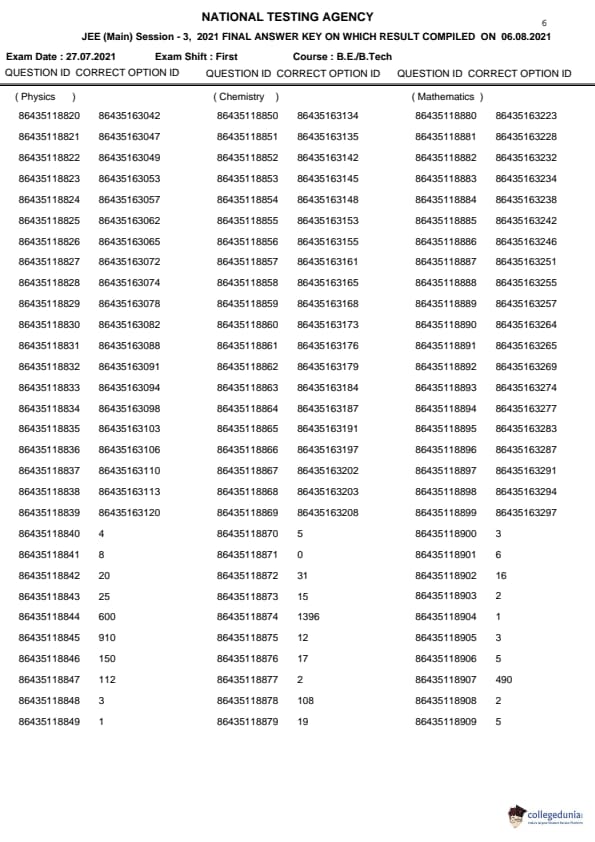 JEE Main BE/B.Tech প্রশ্নপত্রের উত্তর কী PDF