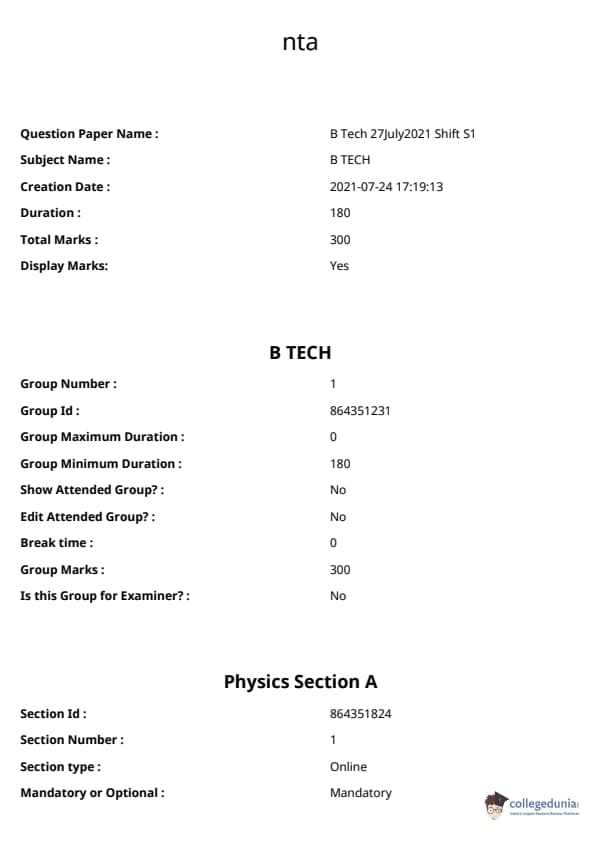 JEE Main B.E./ B.Tech પ્રશ્નપત્ર- 27 જુલાઈ, 2021 બપોર