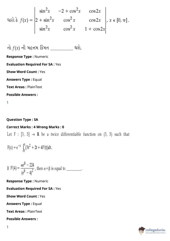 JEE Main 2021 B.E./ B.Tech પ્રશ્નપત્ર- 27 જુલાઈ, 2021- બપોરપછી નિષ્ણાત કોચિંગ સંસ્થાઓ દ્વારા સાધારણ મુશ્કેલ તરીકે રેટ કરવામાં આવ્યું હતું. આ પરીક્ષા JEE Main 3જી સત્રની બીજી પરીક્ષા હતી. પરીક્ષાની મધ્યમ મુશ્કેલીમાં એક મોટું યોગદાન પરિબળ ગણિત વિભાગ હતું, જેમાં ખાસ કરીને સંભાવના અને વિભેદક કેલ્ક્યુલસના મુશ્કેલ અને લાંબા પ્રશ્નો દર્શાવવામાં આવ્યા હતા. મુશ્કેલીની દ્રષ્ટિએ બીજો ભૌતિકશાસ્ત્ર વિભાગ હતો, જેમાં મિકેનિક્સ અને આધુનિક ભૌતિકશાસ્ત્રના નોંધપાત્ર પ્રમાણમાં પ્રશ્નો હતા. રસાયણશાસ્ત્ર વિભાગનું મુશ્કેલી સ્તર જટિલતા અને સિદ્ધાંત આધારિત પ્રશ્નોના સંદર્ભમાં ભૌતિકશાસ્ત્ર વિભાગની સમકક્ષ હતું; રસાયણશાસ્ત્ર વિભાગમાં સૌથી મોટો ફાળો ઓર્ગેનિક કેમિસ્ટ્રી (I અને II) હતો. JEE Main 2022 માટે તૈયારી કરી રહેલા ઉમેદવારો , 20 જુલાઈ, 2021, બપોરના સત્ર માટે આન્સર કી પીડીએફ સાથેના પ્રશ્નપત્રો નીચેથી ડાઉનલોડ કરી શકો છો: