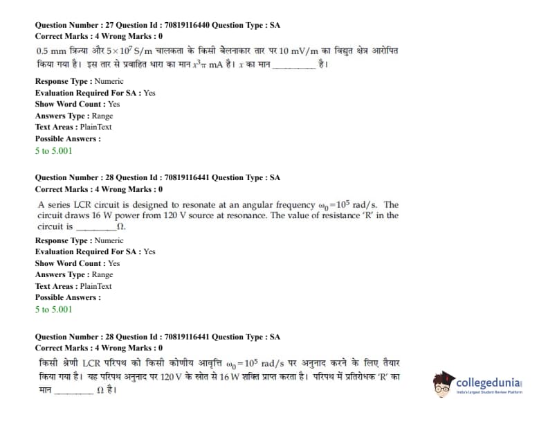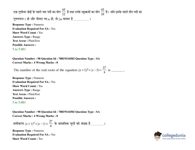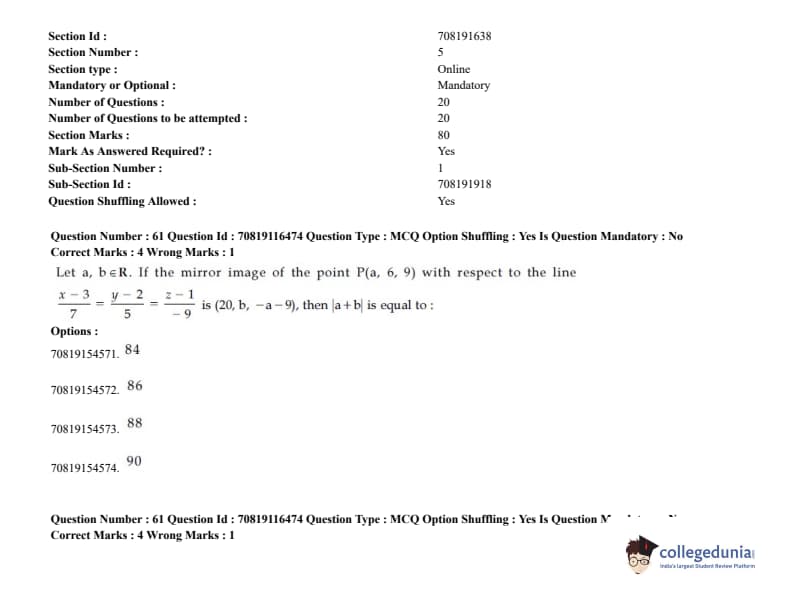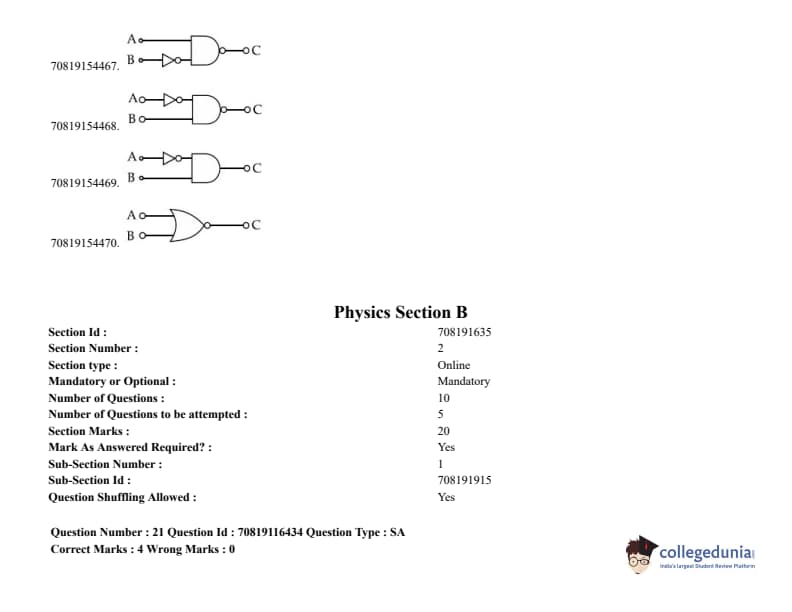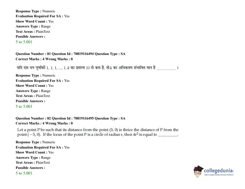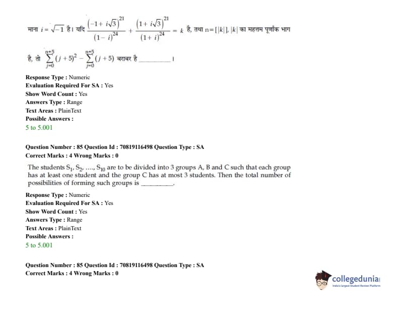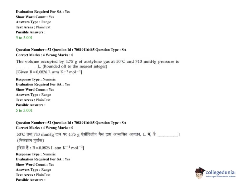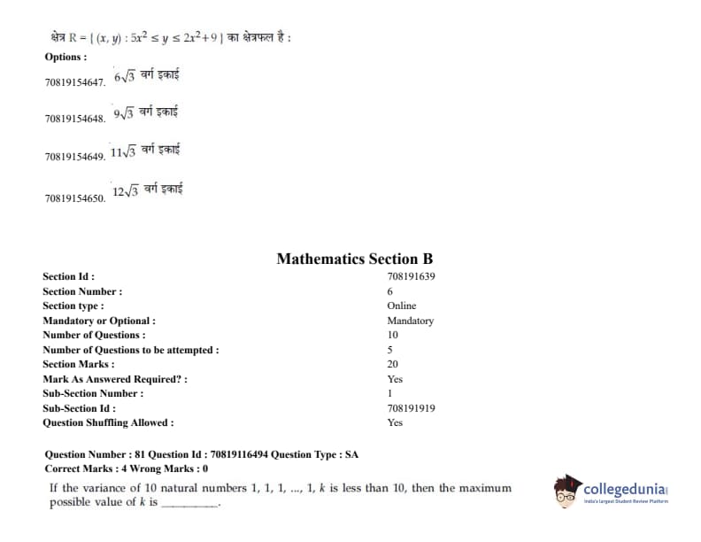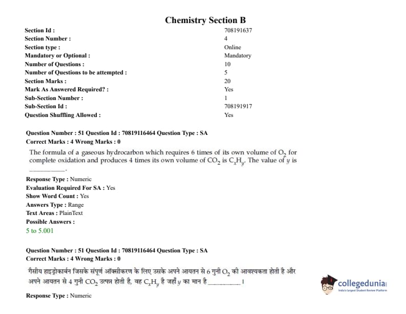 - प्रत्येक खंड में 10 पूर्णांक प्रकार के संख्यात्मक उत्तर प्रश्न थे, जिनमें से उम्मीदवार को किसी भी 5 का प्रयास करने की आवश्यकता थी।