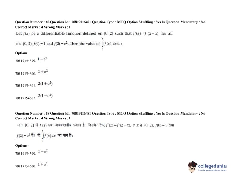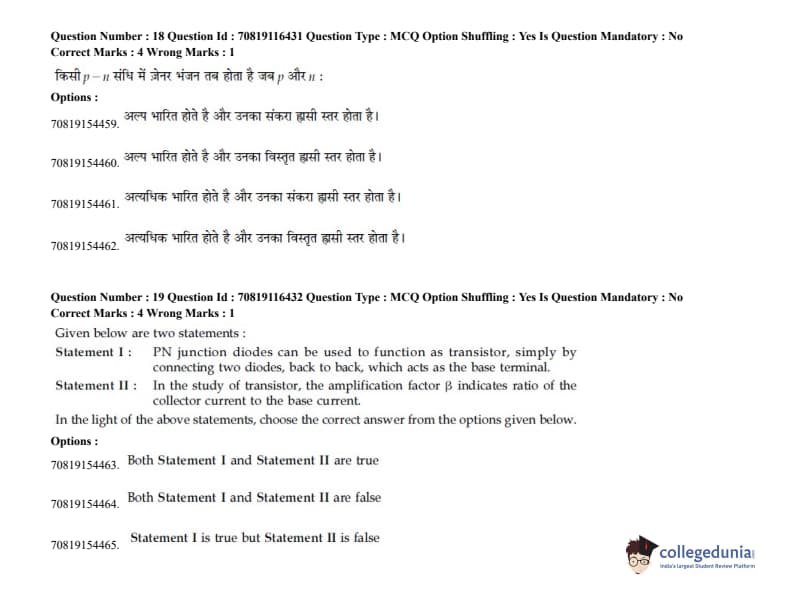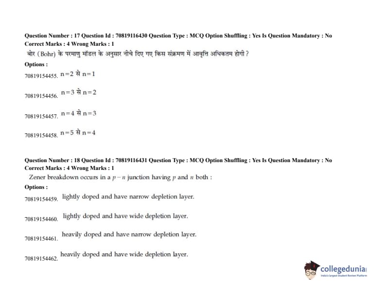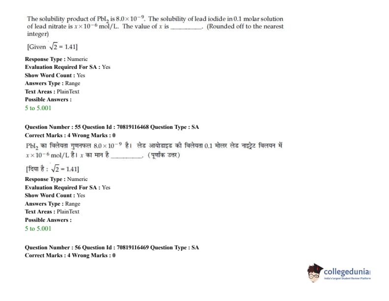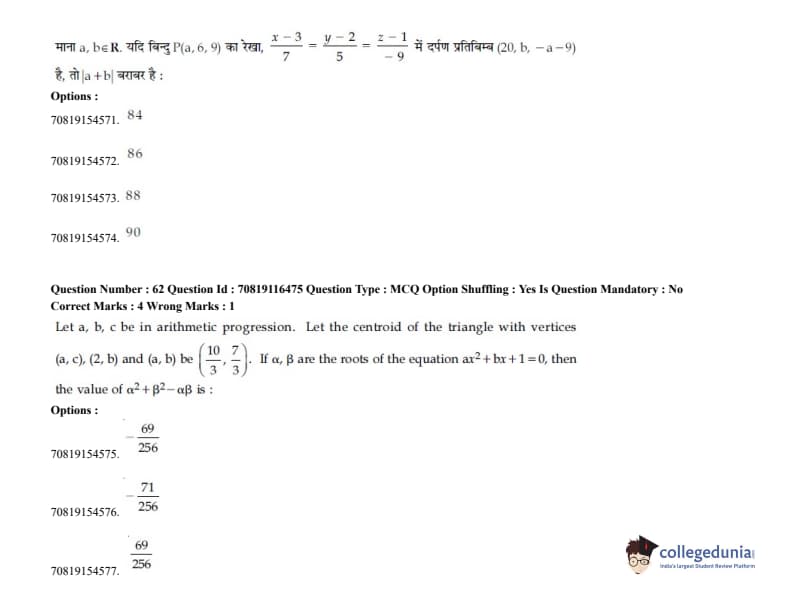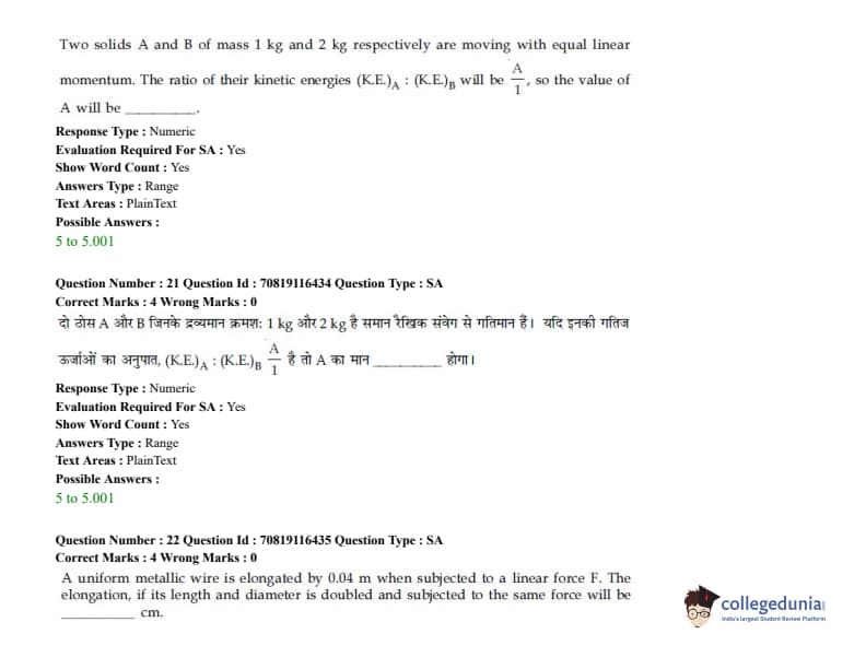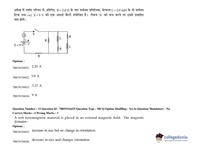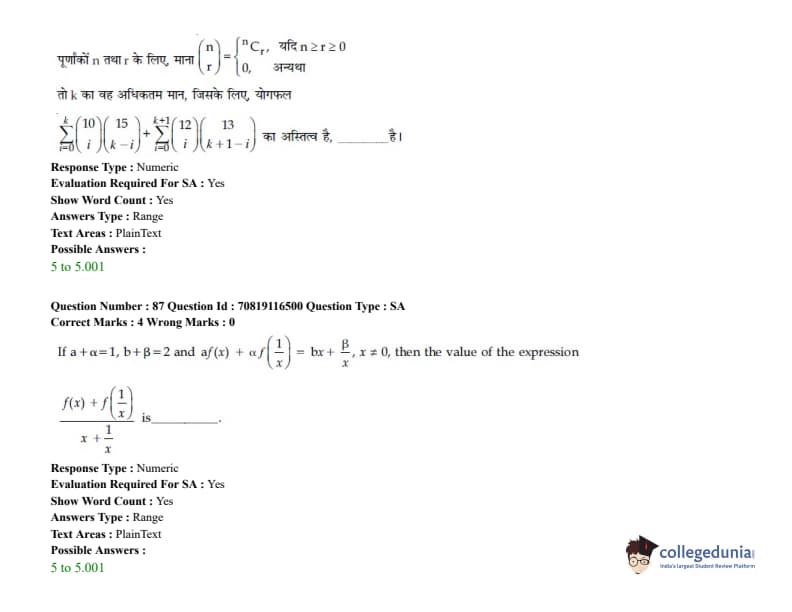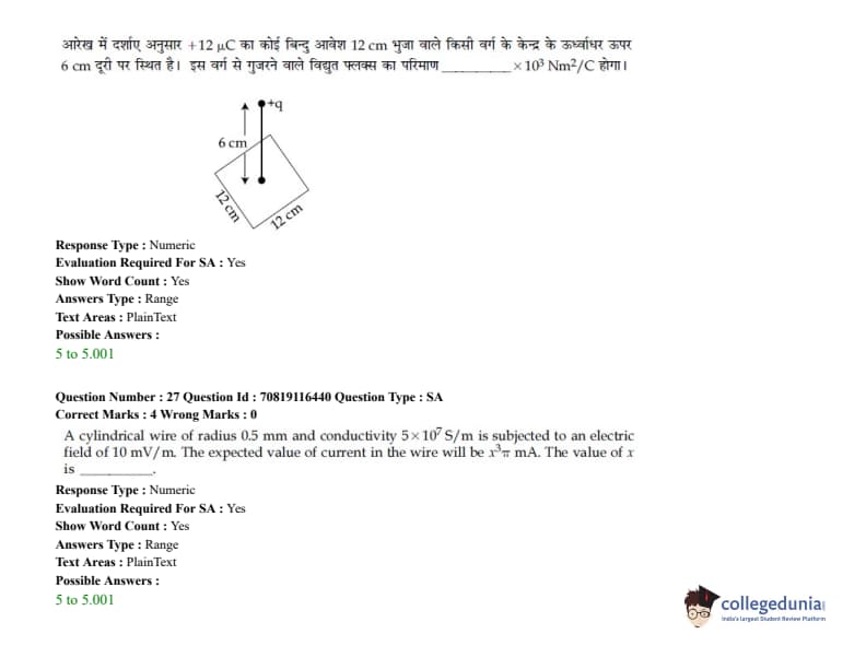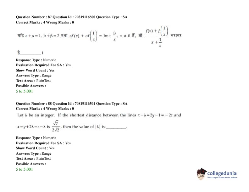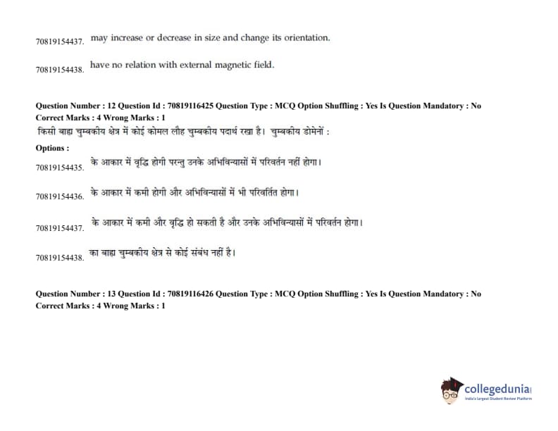 JEE Main 2021 बी.ई./बी.टेक प्रश्न पत्र - 24 फरवरी, 2021- दोपहर के सत्र को मध्यम कठिनाई स्तर का माना गया। वर्ष 2021 के लिए नए JEE Main परीक्षा पैटर्न के बाद, पेपर में कुल 90 प्रश्न थे, जिनमें से उम्मीदवारों को 75 प्रश्नों का प्रयास करना था। प्रत्येक अनुभाग में उम्मीदवार को 10 संख्यात्मक उत्तर प्रकार के प्रश्नों में से किसी भी 5 को हल करने का विकल्प दिया गया था। पेपर में गणित सबसे कठिन खंड था, उसके बाद भौतिकी का स्थान था। रसायन विज्ञान पेपर का सबसे आसान खंड था जिसमें प्रत्यक्ष सूत्र और समीकरण-आधारित प्रश्न शामिल थे। JEE Main 2022 परीक्षा के इच्छुक उम्मीदवार अभ्यास के लिए 24 फरवरी, 2021 सत्र के लिए उत्तर कुंजी पीडीएफ के साथ JEE Main प्रश्न पत्र डाउनलोड कर सकते हैं।
