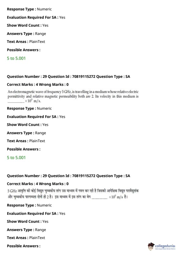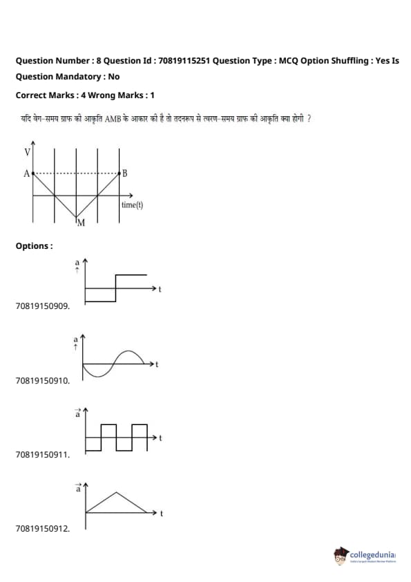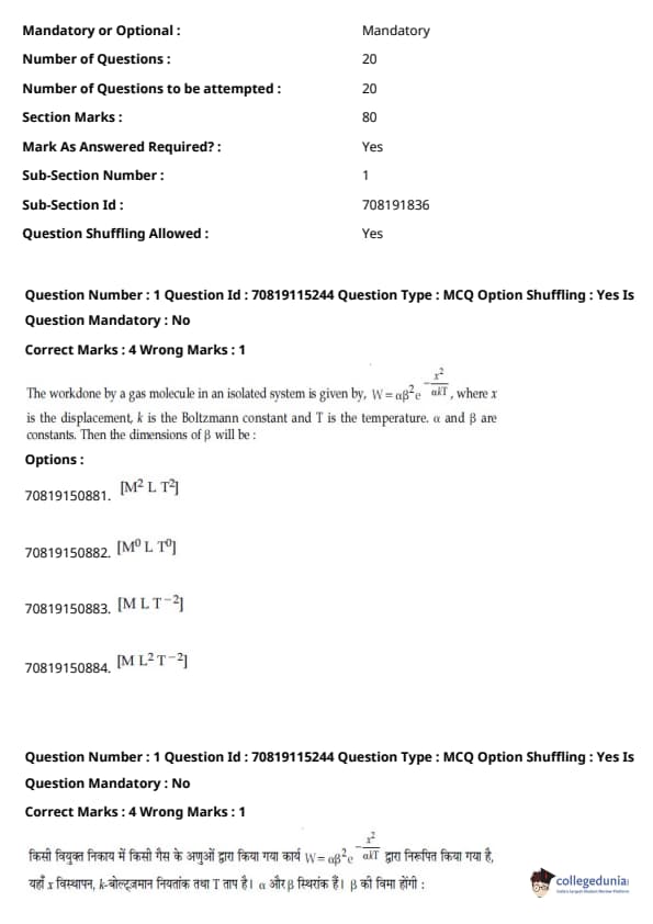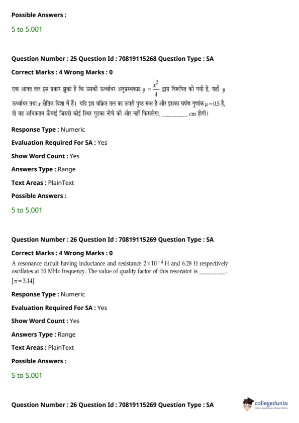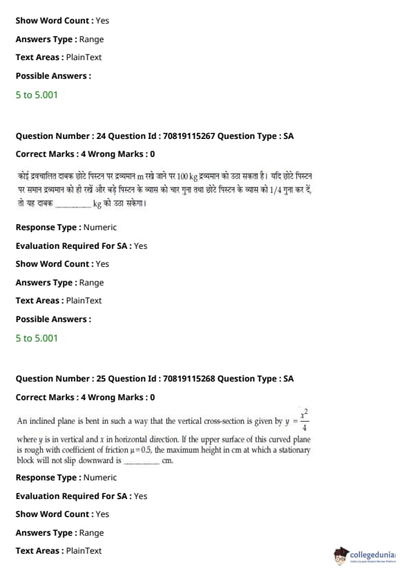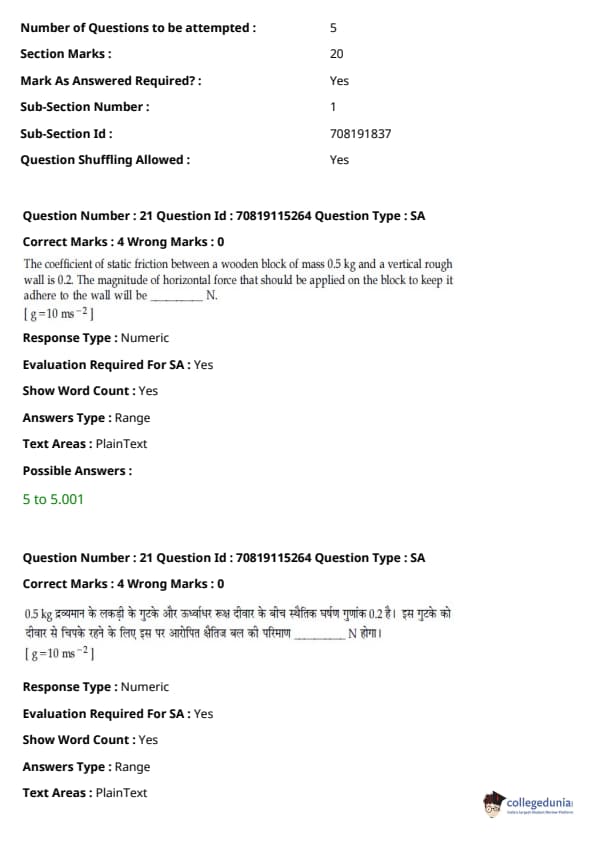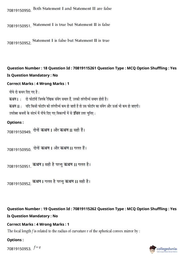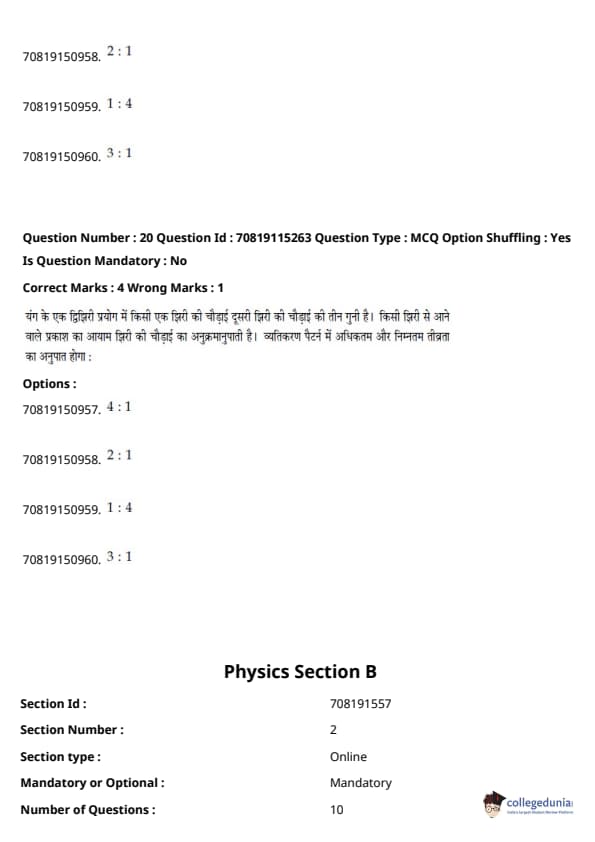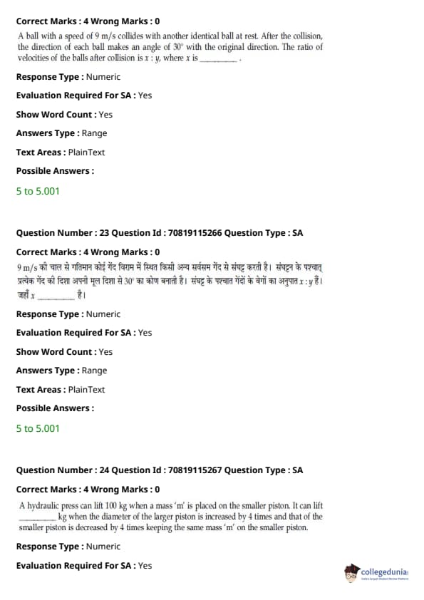 - फिजिक्स सेक्शन अन्य सेक्शन की तुलना में आसान था। यद्यपि गणना-आधारित प्रश्नों की संख्या सिद्धांत-आधारित प्रश्नों की तुलना में अधिक थी, वे अधिकतर छोटे थे और प्रत्यक्ष सूत्र के एक या अन्य रूपांतरों को शामिल करते थे।