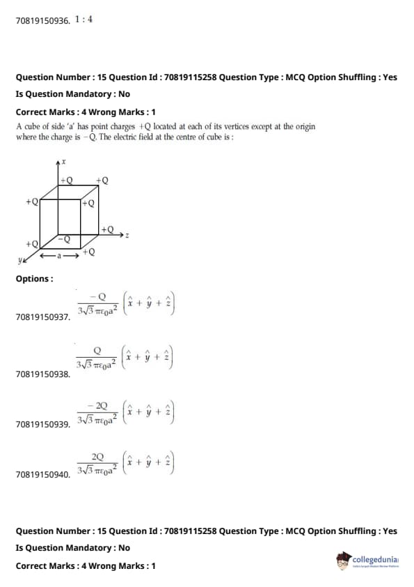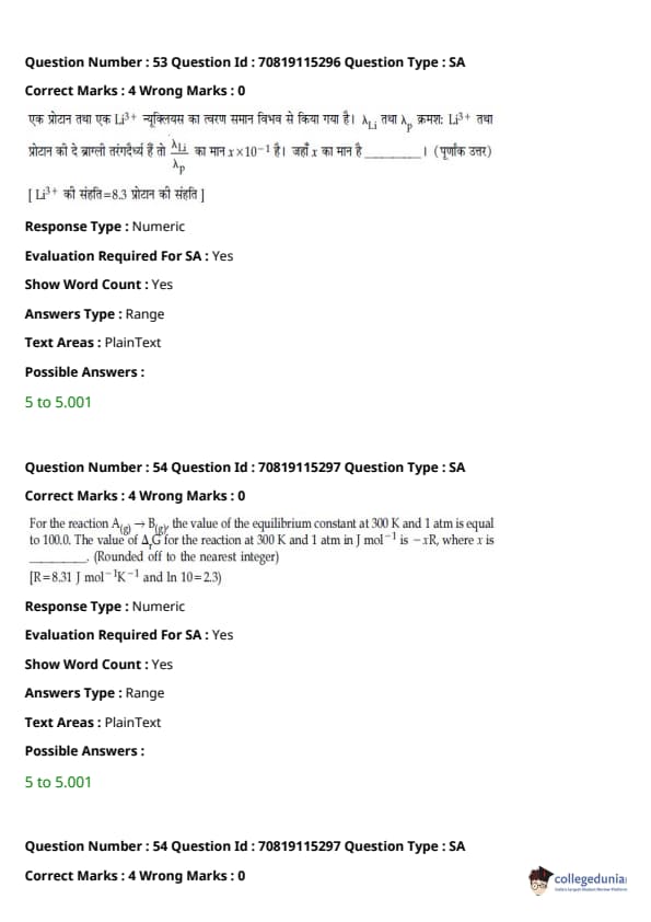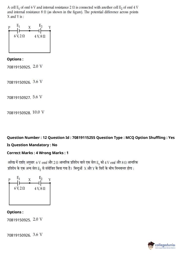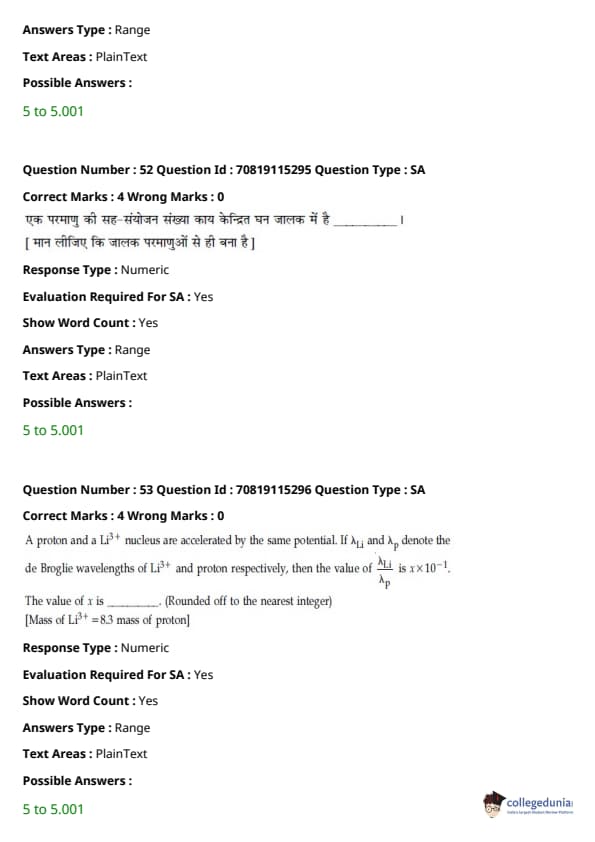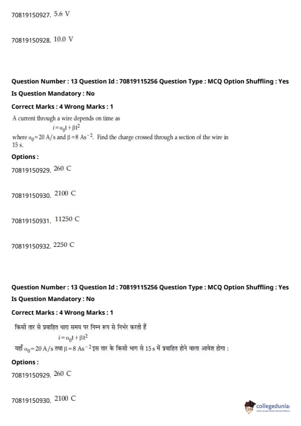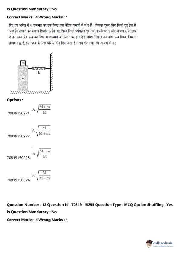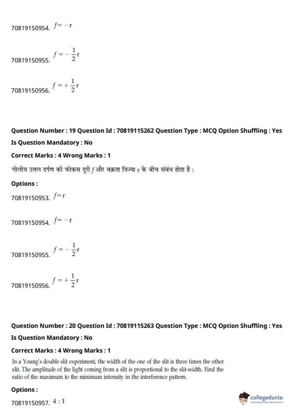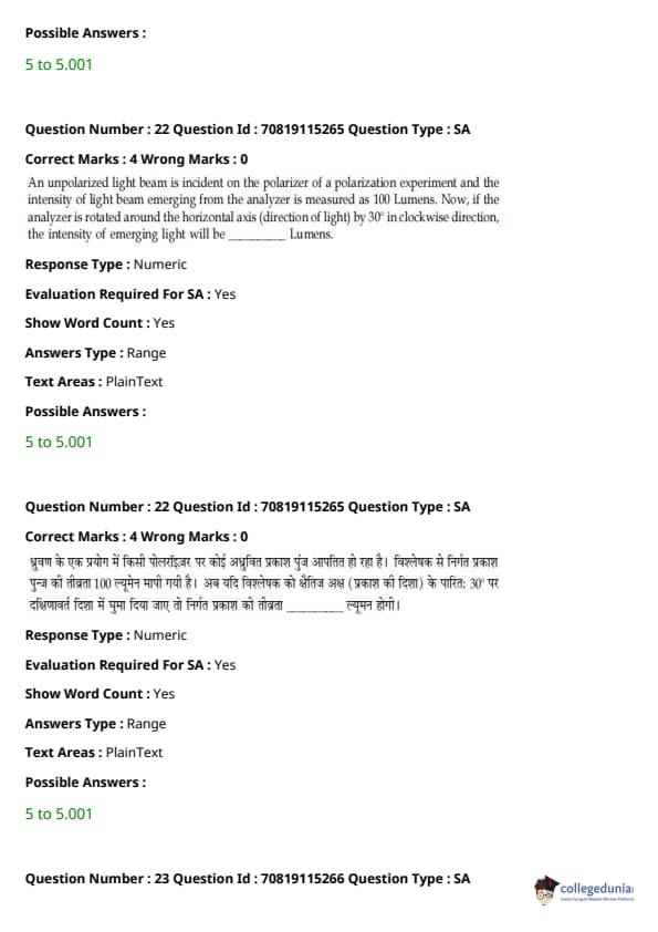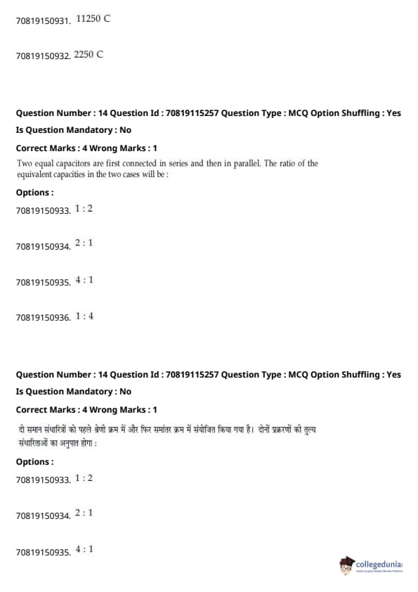 - फिजिक्स सेक्शन अन्य सेक्शन की तुलना में आसान था। यद्यपि गणना-आधारित प्रश्नों की संख्या सिद्धांत-आधारित प्रश्नों की तुलना में अधिक थी, वे अधिकतर छोटे थे और प्रत्यक्ष सूत्र के एक या अन्य रूपांतरों को शामिल करते थे।